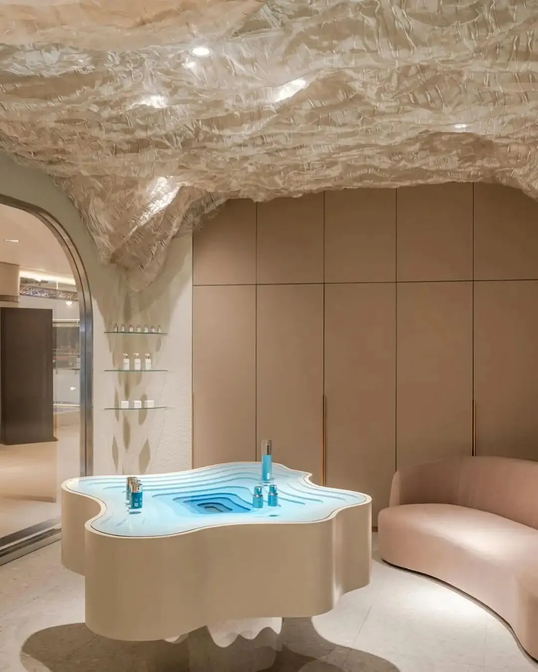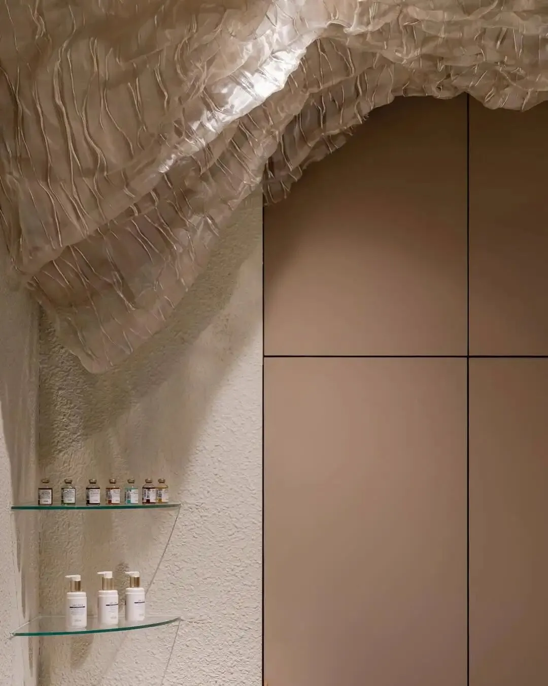 spacemen studio为一家水疗中心设计的内部装饰:綠洲,从沙漠地形的自然景观的宁静之美中获得灵感,营造出雕塑般的沙丘和水塘。