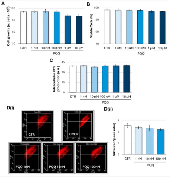 《NPJ Aging》2024年刊载的研究进一步证实:10μMPQQ即可显著提升衰老成纤维细胞的线粒体膜电位(+28%),降低ROS水平(–34%),并延长细胞复制寿命20%以上。这意味着,PQQ有助于修复可见皱纹,更在细胞深处按下“延缓衰老”的开关。