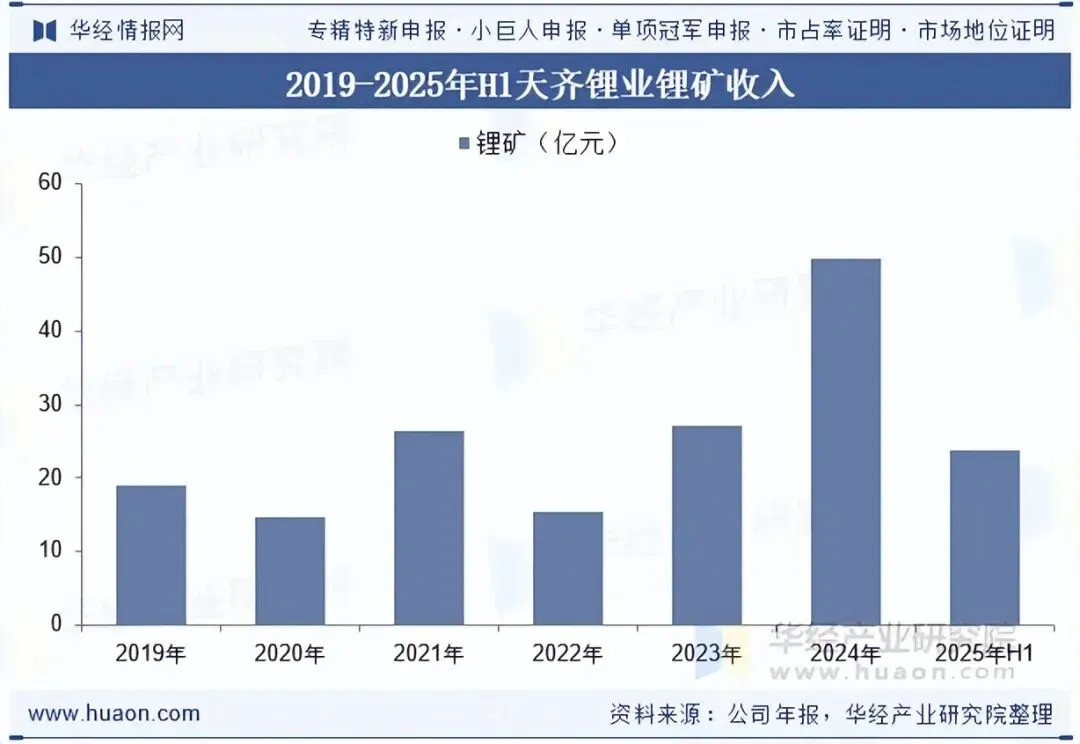 天齐锂业深耕锂行业已30余年,通过战略性布局中国、澳大利亚和智利的锂产业链,为全球多个国家和地区提供优质的产品和服务。公司主要产品包括锂精矿产品和锂化工产品,产品广泛应用于电动汽车、三类电子产品、新型储能、无人机、玻璃、陶瓷等终端市场。2025年上半年,公司锂矿收入为23.8亿元。