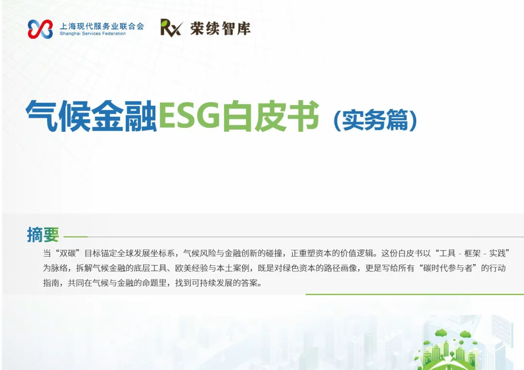 白皮书由上海现代服务业联合会与荣续 ESG 智库联合发布,以 “工具 - 框架 - 实践” 为脉络,拆解气候金融底层工具、欧美经验与本土案例,搭建可落地的气候金融行动框架,为政府、金融机构、实体企业提供气候金融领域的共识手册,助力在气候与金融交叉领域找到确定性增长路径。