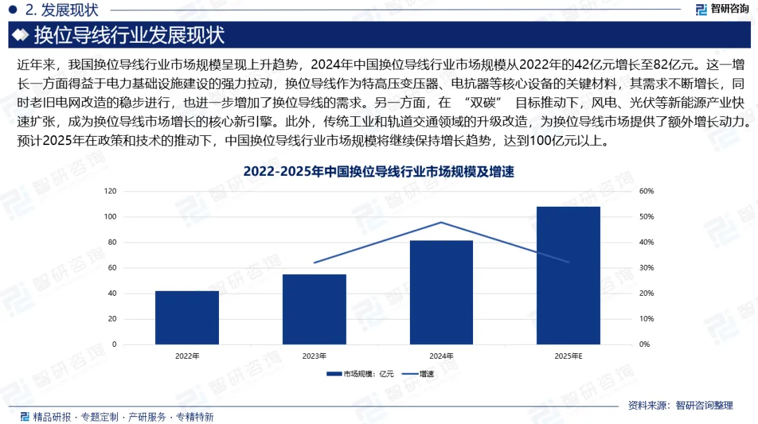 换位导线系指以一定根数的漆包铜扁线组合成宽面相互接触的两列,并按要求在两列漆包线的上面和下面沿窄面作同一转向的换位,并用电工绝缘纸带作多层连续紧密包绕组成。与普通扁线相比,换位导线具有诸多优点,如降低损耗、提高散热性、增强机械强度、节省空间、简化工艺等,这使得换位导线在大型电力变压器的绕组中得到广泛应用。近年来,我国换位导线行业市场规模呈现上升趋势,2024年中国换位导线行业市场规模从2022年的42亿元增长至82亿元。这一增长一方面得益于电力基础设施建设的强力拉动,换位导线作为特高压变压器、电抗器等核心设备的关键材料,其需求不断增长,同时老旧电网改造的稳步进行,也进一步增加了换位导线的需求。另一方面,在 “双碳” 目标推动下,风电、光伏等新能源产业快速扩张,成为换位导线市场增长的核心新引擎。此外,传统工业和轨道交通领域的升级改造,为换位导线市场提供了额外增长动力。预计2025年在政策和技术的推动下,中国换位导线行业市场规模将继续保持增长趋势,达到100亿元以上。