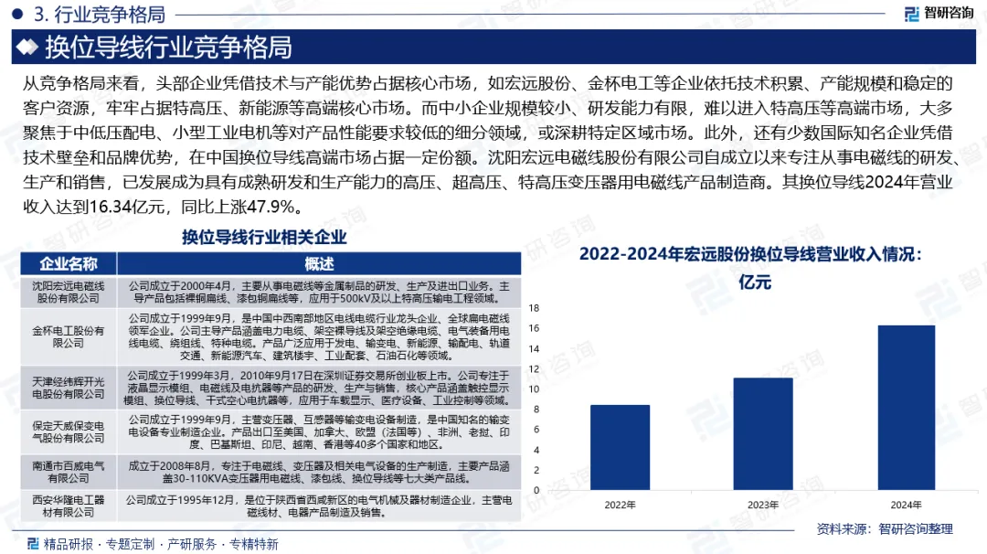 企业格局:从竞争格局来看,头部企业凭借技术与产能优势占据核心市场,如宏远股份、金杯电工等企业依托技术积累、产能规模和稳定的客户资源,牢牢占据特高压、新能源等高端核心市场。而中小企业规模较小、研发能力有限,难以进入特高压等高端市场,大多聚焦于中低压配电、小型工业电机等对产品性能要求较低的细分领域,或深耕特定区域市场。此外,还有少数国际知名企业凭借技术壁垒和品牌优势,在中国换位导线高端市场占据一定份额。