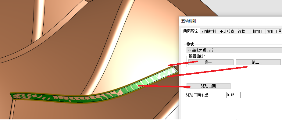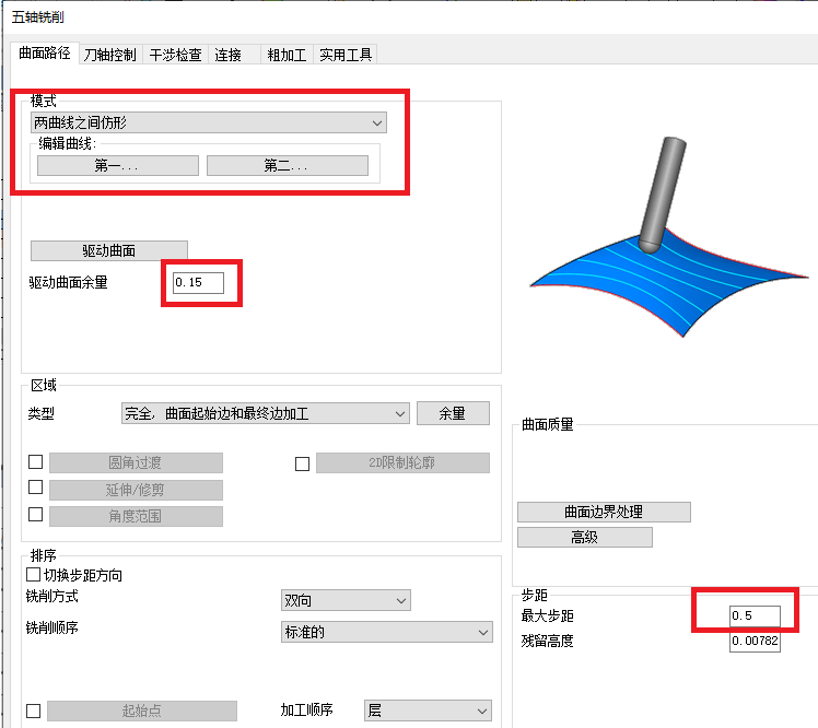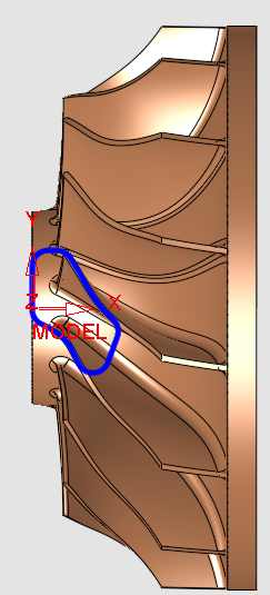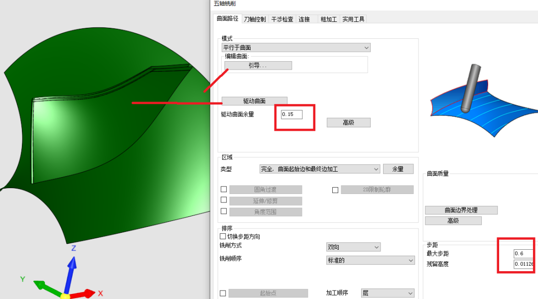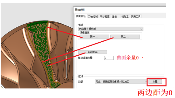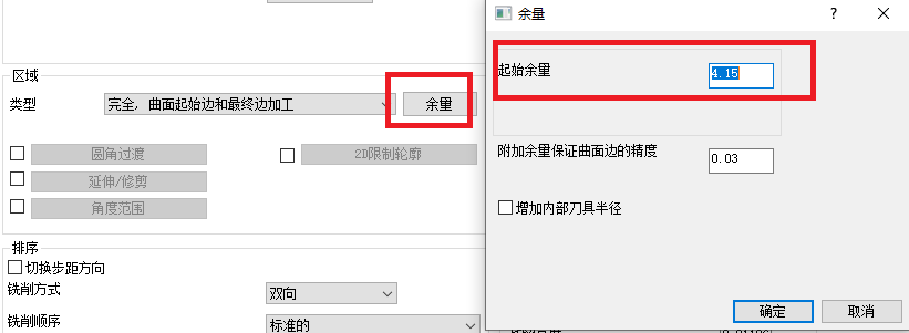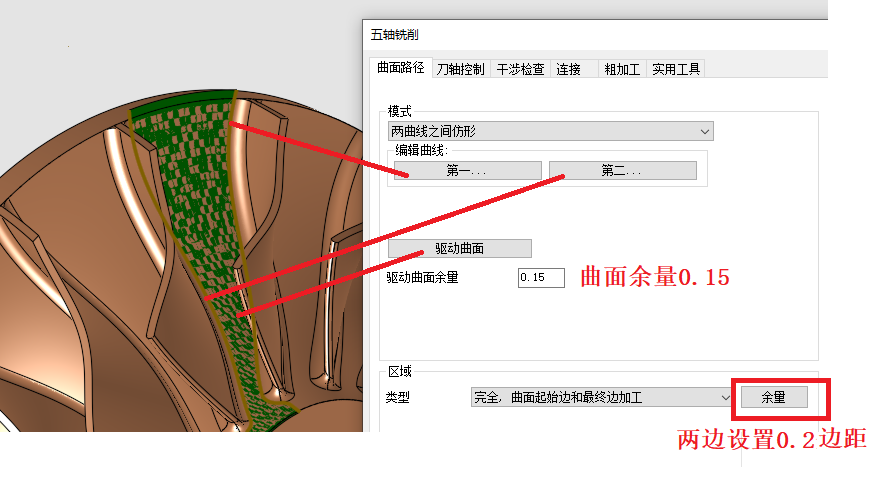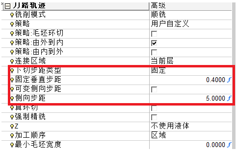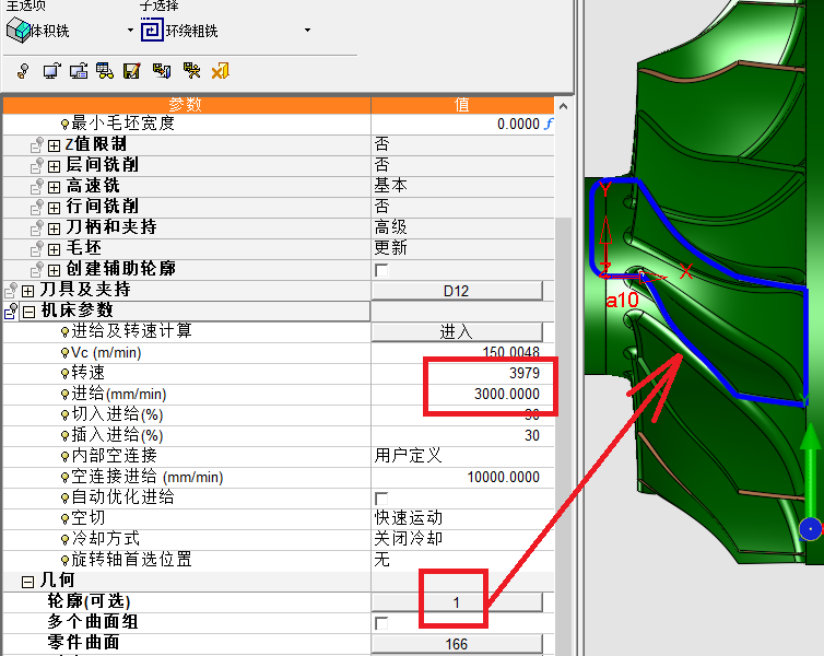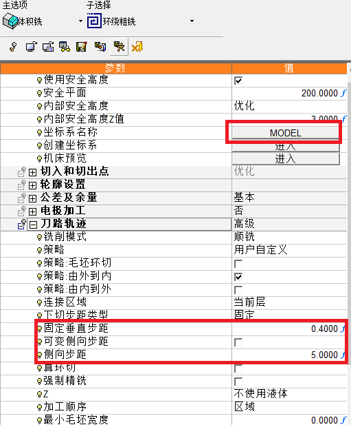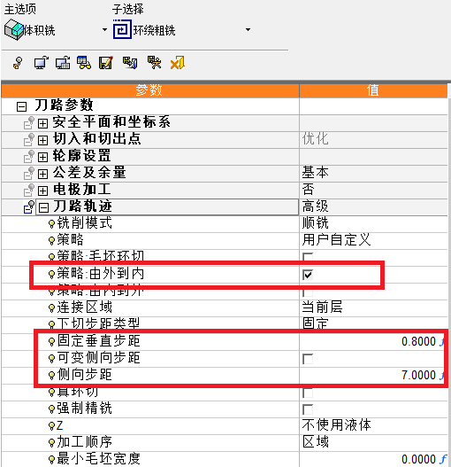 采用体积铣--粗加工环切策略,加工范围选择上图的建立的轮廓。刀具为D8立铣刀。切深0.4,步距5,转速S5968,F3000。余量0.5