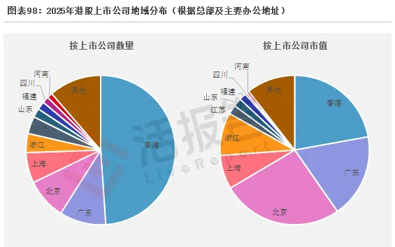 以数量看,广东、北京、上海、浙江、江苏五个省份的上市公司较多,分别有270家、239家、177家、111家及101家,分别占比在4%至10%左右;以市值看,北京、广东、浙江、上海四地的上市公司市值分别达12.4万亿、8.6万亿、4.4万亿、3.5万亿港元,占比分别为26.2%、18.2%、9.3%、7.3%