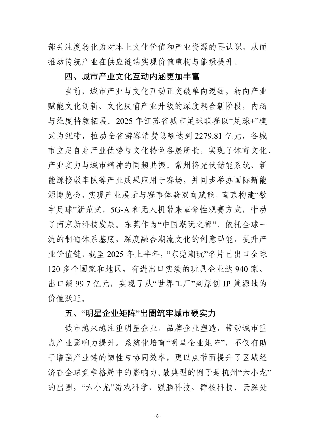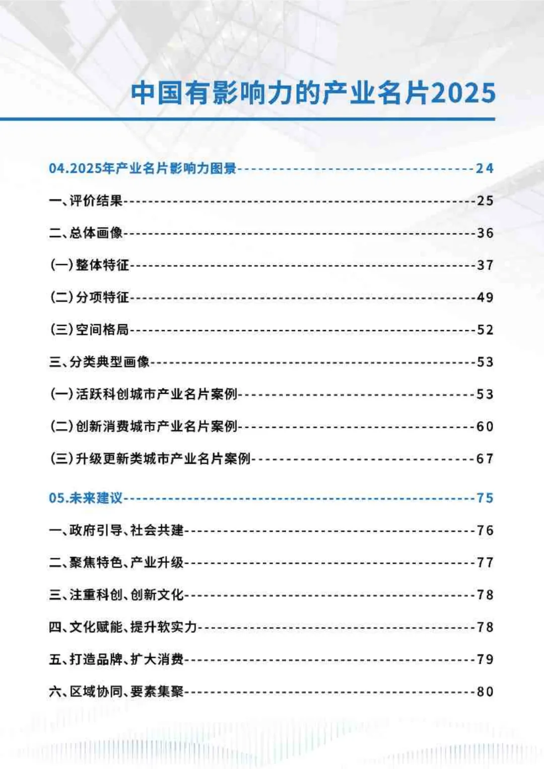 在全球经济日益呈现跨界融合趋势的背景下,城市产业、科技与文化的深度结合正成为推动区域经济高质量发展的关键路径。产业名片承载着区域的产业实力、科技创新能力和文化生态优势,是城市在全球经济中影响力和话语权的重要体现。近年来,随着我国制造业的快速发展,产业链集群优势逐步显现,部分城市凭借其在全球制造体系中的重要地位,影响力持续提升。工业和信息化部工业文化发展中心致力于推动城市在产业、科技与文化方面的深度融合,打造具有创新生态和文化软实力的产业名片。2024年,首次发布《中国有影响力的产业名片》,涵盖30个城市和50个县市,初步勾勒出各具特色的中国城市产业名片图景。产业名片的“影响力”是衡量城市走向全国乃至全球的重要标准。2025年,在产业文化融合的推动下,更多城市将展现其科技硬实力与文化软实力。杭州的视觉智能“六小龙”成为核心科创品牌,东莞的制造美学推动产业升级,“苏超”与“新能源产业高地”则成为常州的城市双IP。课题组在去年研究基础上,继续从“产业、名片、生态”三个维度出发,聚焦“影响力”和“全球性”,构建“中国城市产业名片影响力指数”,深入探讨中国城市产业名片在全球范围内的影响力变化与发展态势。研究显示,新质生产力、消费扩大、城市更新等趋势正在重塑产业名片的发展格局。