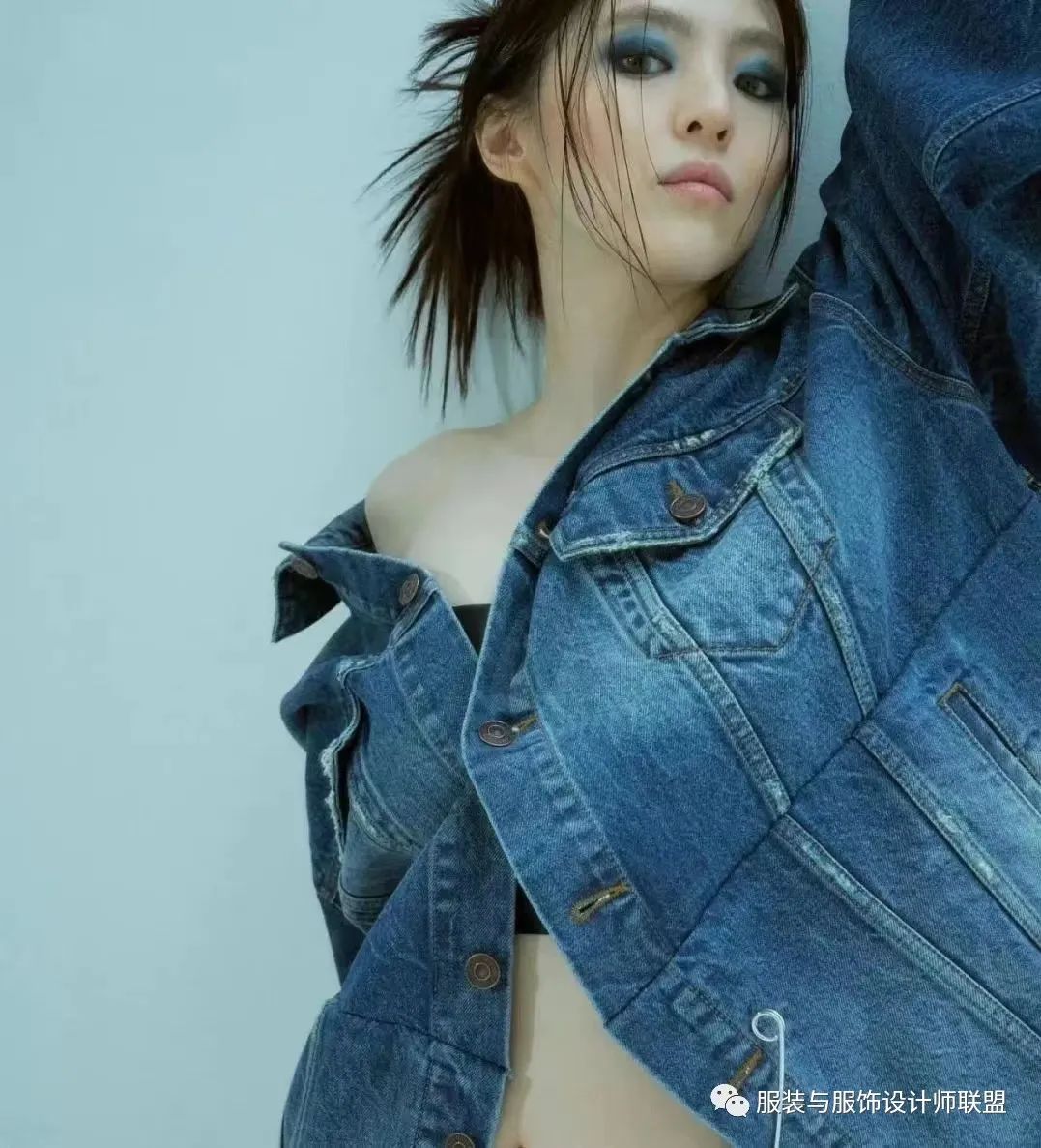 另一套造型中,在黑色抹胸外罩一件牛仔外套,与衣服相呼应的蓝色眼影传达着不羁与叛逆。