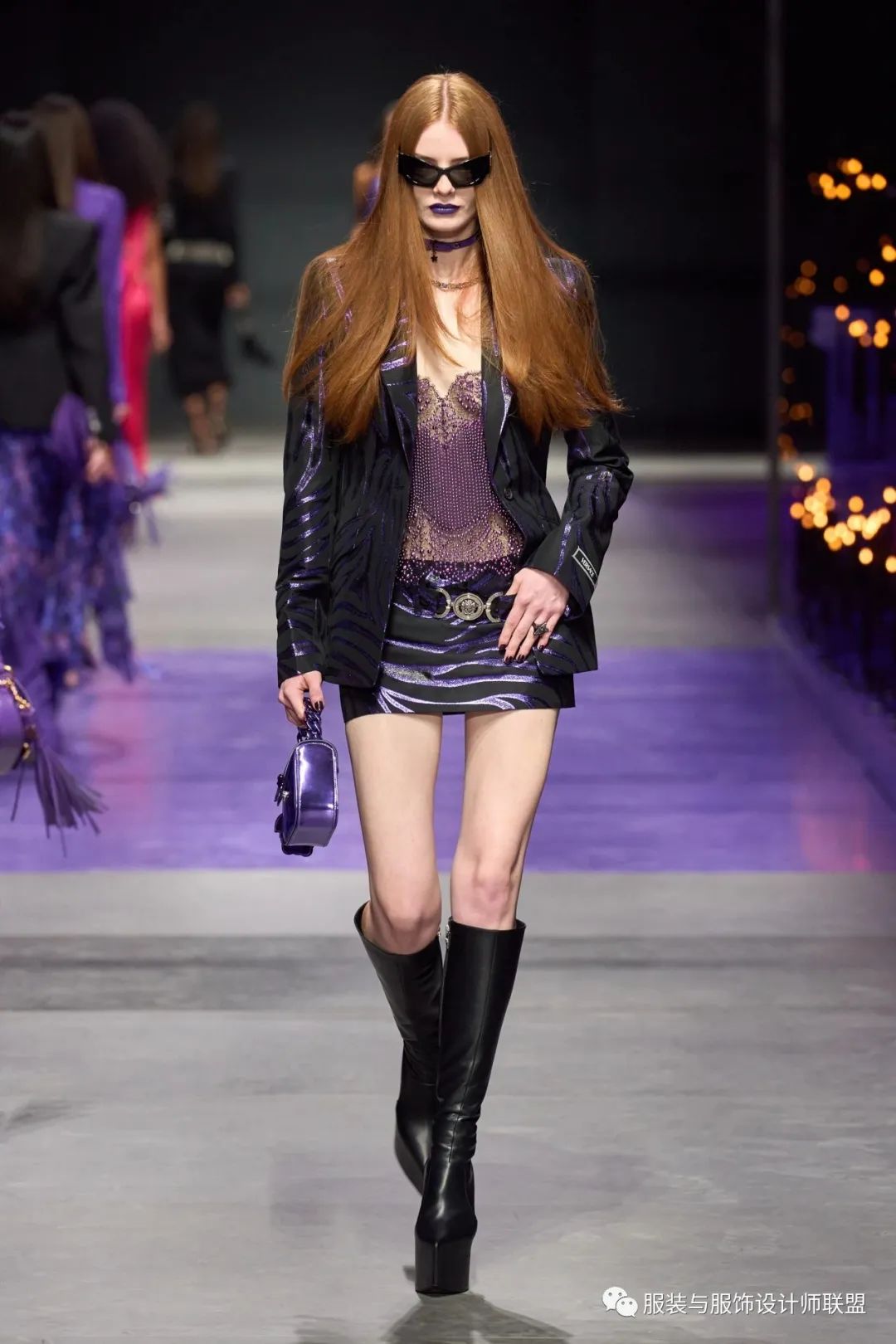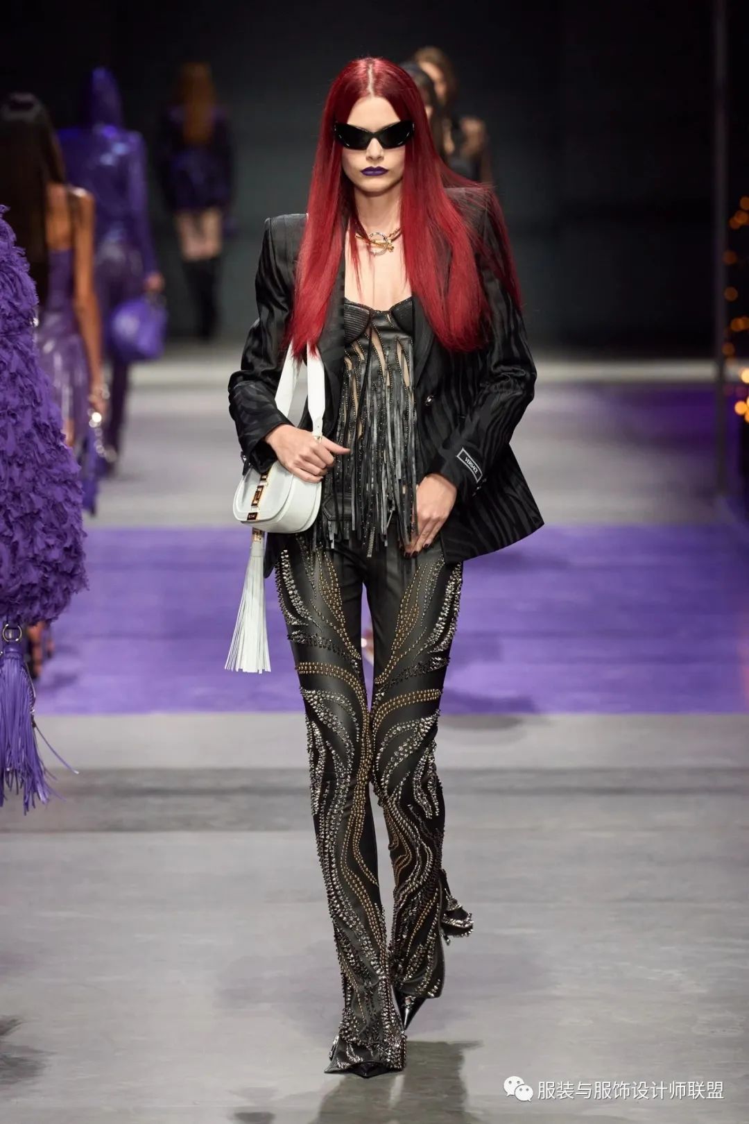 对于Versace 2023春夏系列,Donatella在秀场备注中提到:“我一直喜欢有反叛精神的女性,自信聪明有力量”,系列中的黑色是哥特的化身,充满反叛精神又魅力四射,连衣裙在胸口位置被径直裁开一道,撩人风情若隐若现,危险也在此间回荡。紫色更是性感的代名词,皮革流苏摩挲双腿,自由洒脱而锋芒毕露。