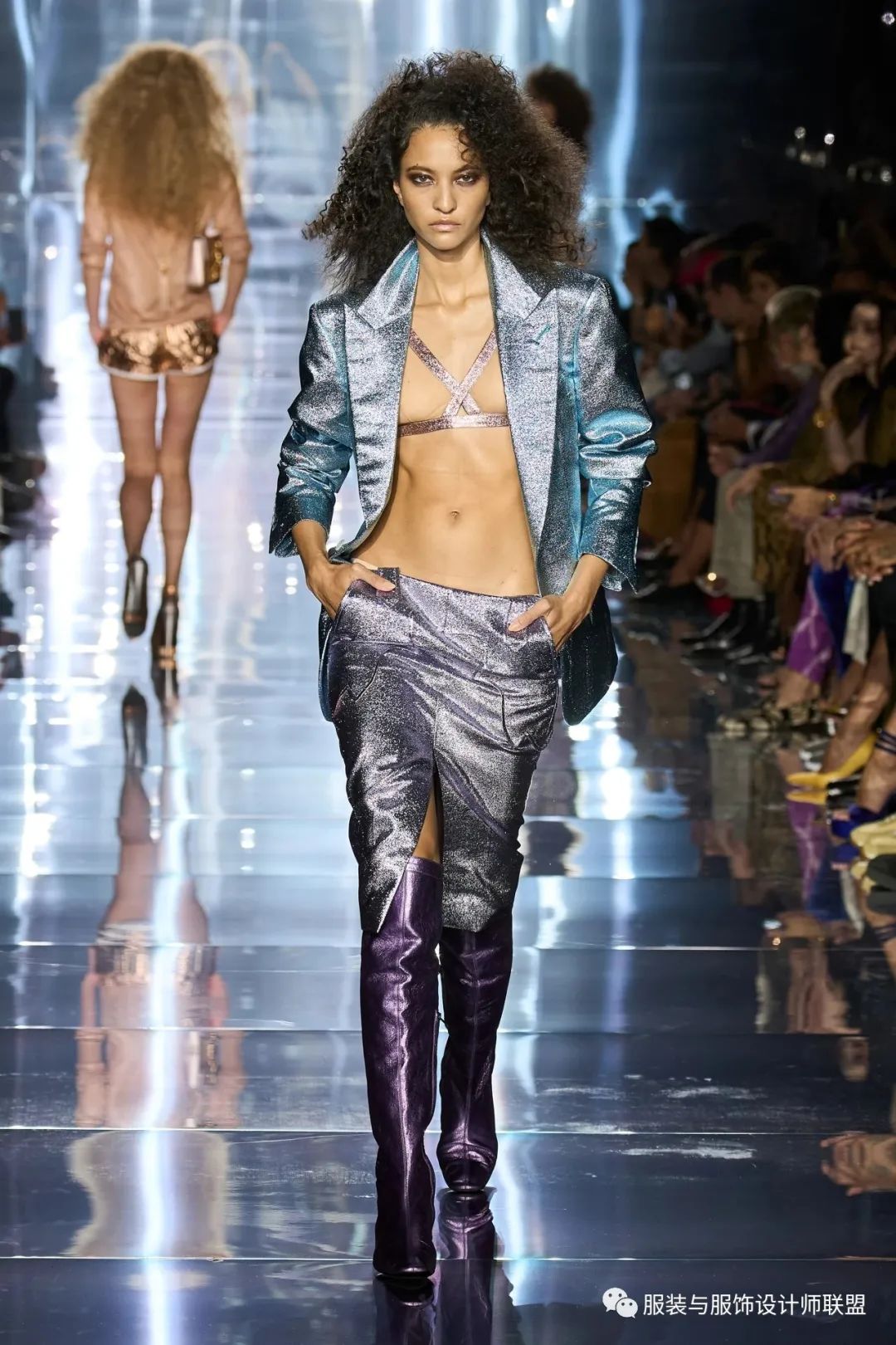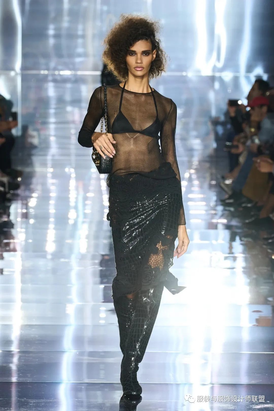 Tom Ford和Versace的2023春夏系列则分别展现了摇滚和哥特文化。Tom Ford 2023春夏秀场中,模特们顶着爆炸头款款走来,亮片、渔网、漆皮等摇滚元素贯穿整个系列,外漏的内衣打造魅惑氛围,金属光泽的服装华丽炫目,完美演绎了迷人又危险的都市女郎形象。