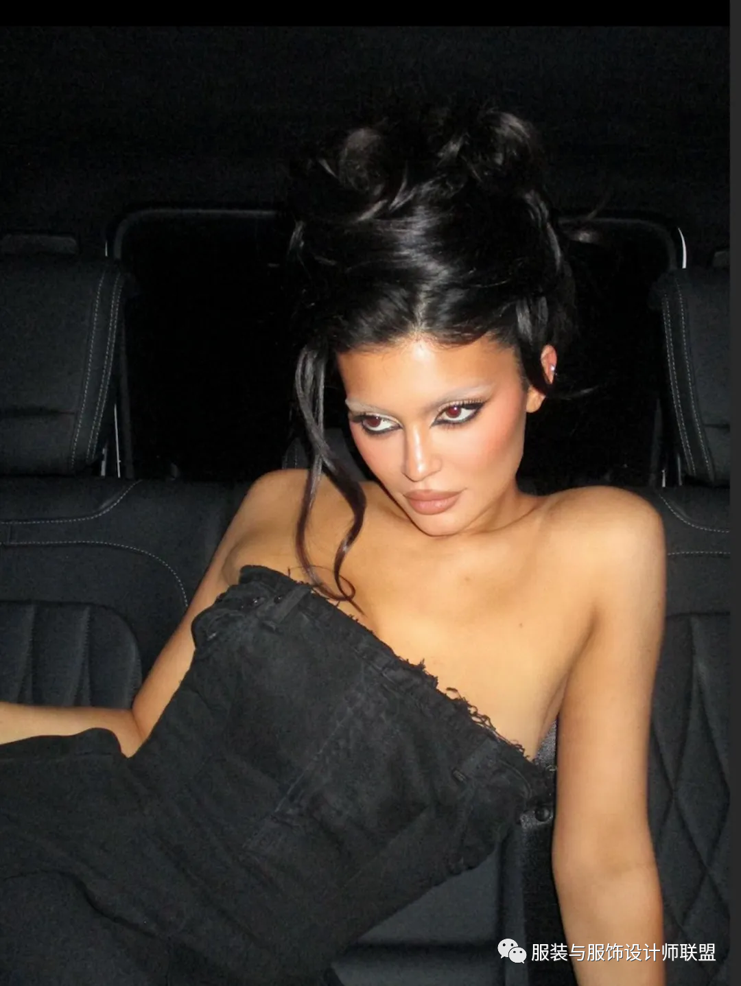 Kylie Jenner近期也尝试了这种风格,将眉毛漂白,搭配全包眼线和强调唇线的妆容,身上穿一件黑色抹胸,展现深藏于内心的拽姐一面。