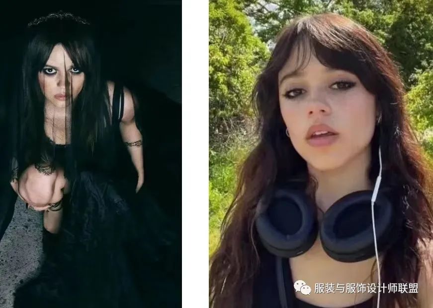 而去年热播的《星期三》,Wednesday的黑暗萝莉形象深入人心,在社交网络上形成了“星期三效应”,再次推动了暗黑、怪诞的哥特文化进入主流视野。演员Jenna Ortega不论是剧内剧外,都是暗黑少女的形象,黑色穿着搭配烟熏妆,冷酷又神秘。