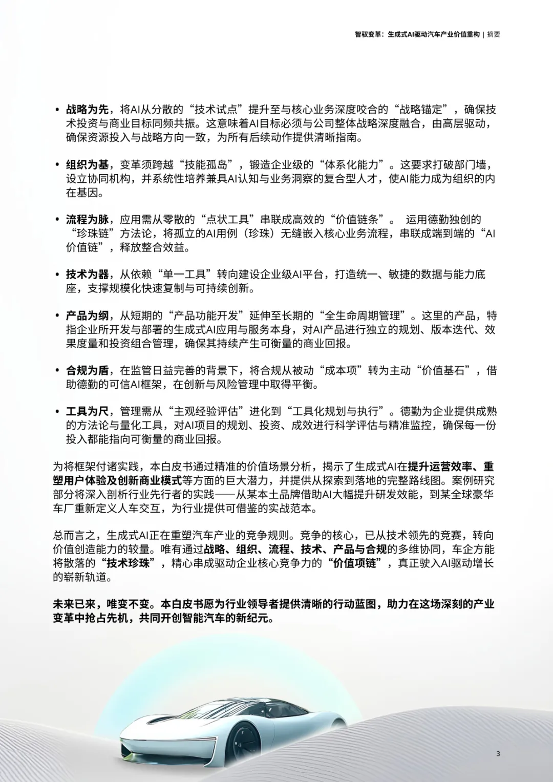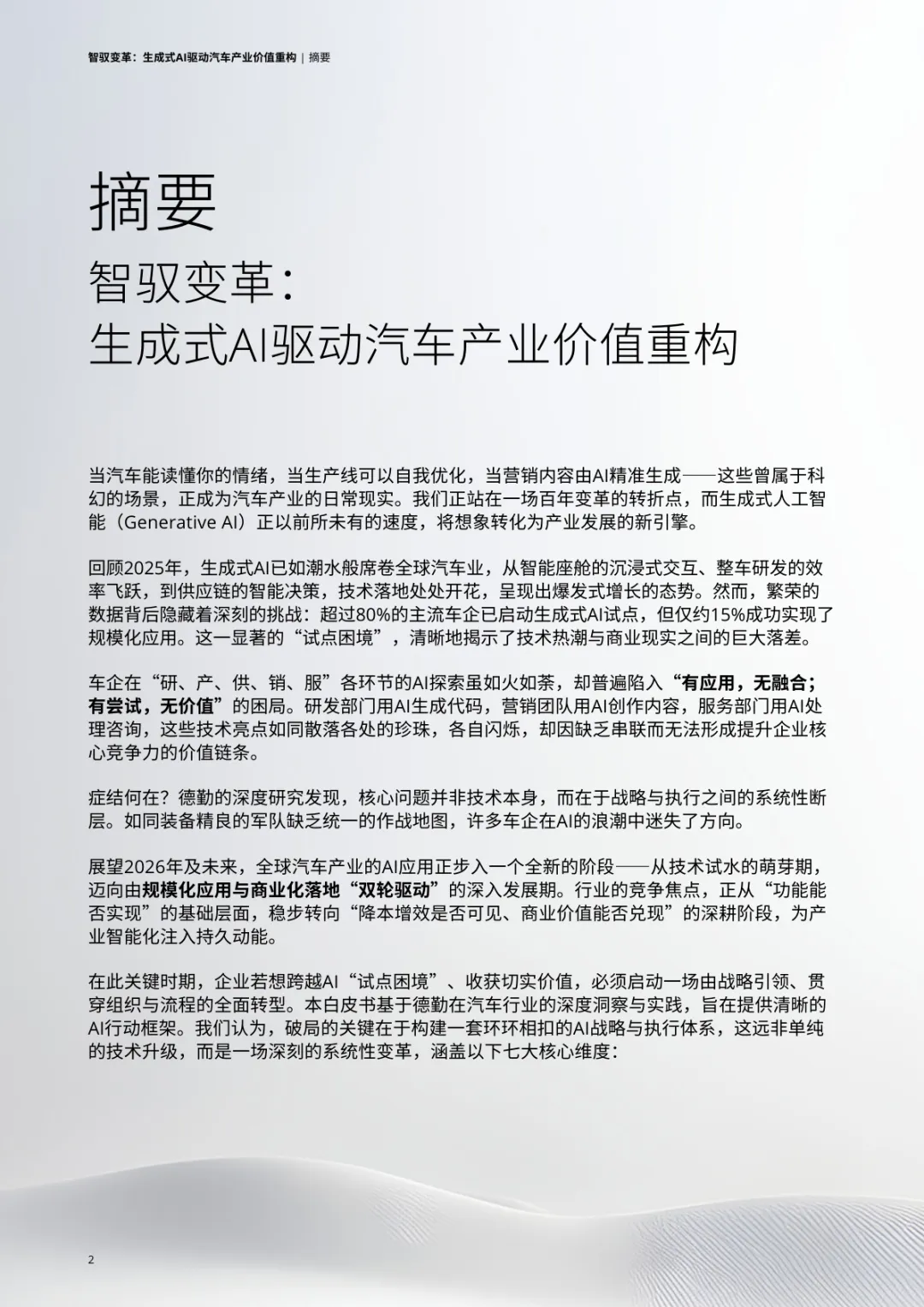 智驭变革:生成式AI重构汽车产业价值,全链条赋能开启新赛道!《智驭变革:生成式AI驱动汽车产业价值重构》指出,汽车产业正面临百年未遇的转型压力,生成式AI作为核心引擎,从研发、生产到营销、服务全链路重塑产业格局,推动行业从技术试点迈向规模化价值落地。