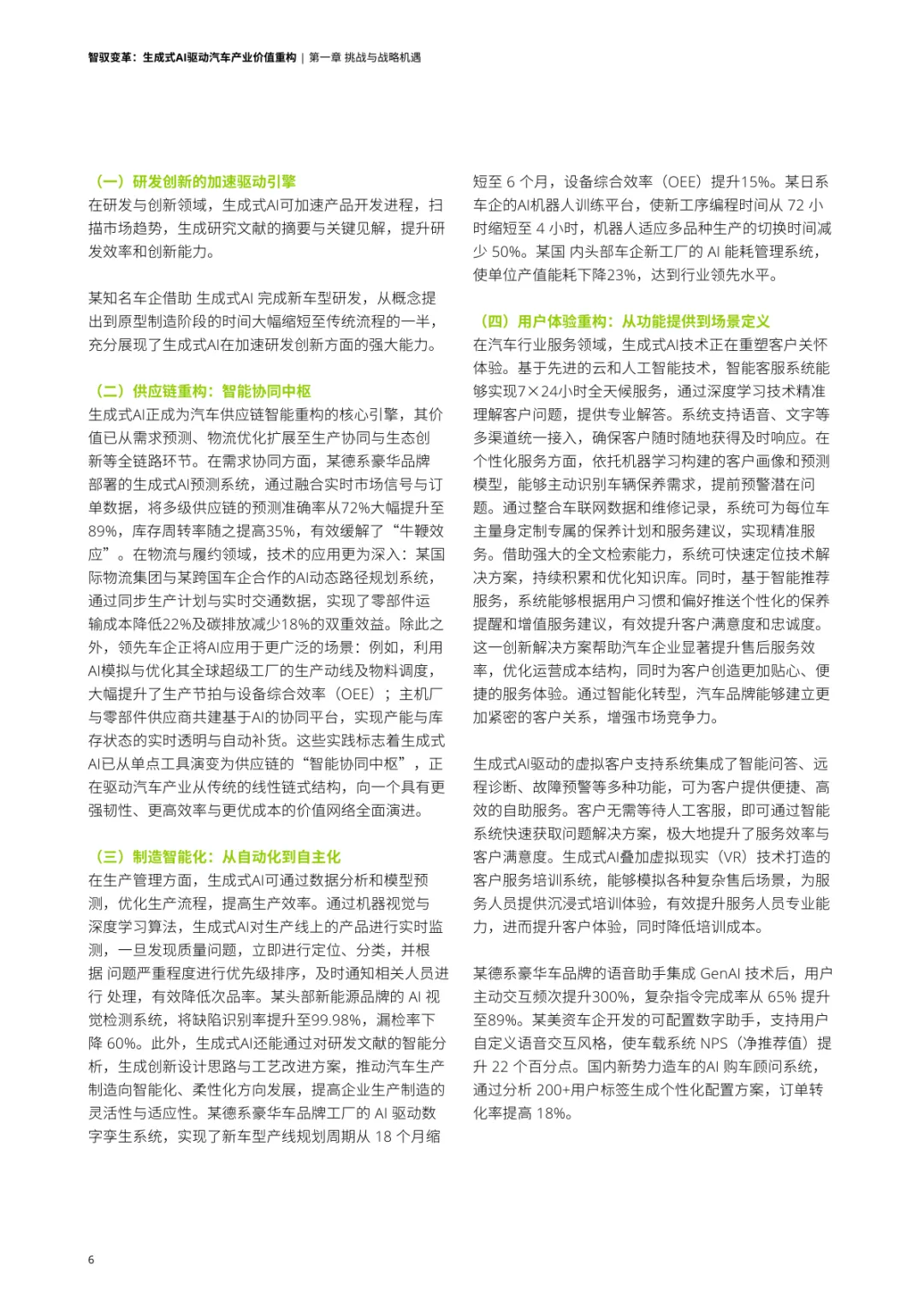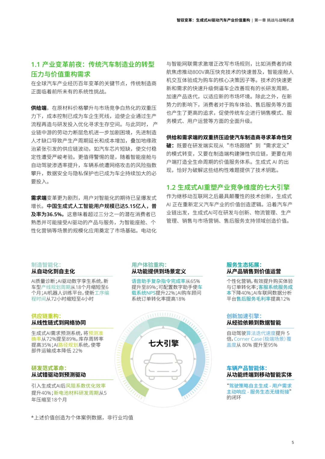 三大价值驱动:聚焦效率价值(流程自动化、成本优化)、体验价值(个性化服务、差异化体验)、核心能力价值(创新突破、决策升级),实现“用更少资源做更多事、精准匹配需求、构建数字核心能力”的目标。 收入增长场景:覆盖研发、供应链、销售、售后等领域,可实现1%-2%收入增长,如动态定价模型优化、个性化产品推荐、AI购车顾问提升订单转化率18%,研发效率提升带动产品迭代加速。 成本优化空间:销售管理费用效率提升5%-20%,产品成本节省5%-10%,如营销内容自动生成、IT代码转换自动化、供应链库存优化、生产过程质量问题智能识别,单家车企平均可获70亿美元价值机遇。