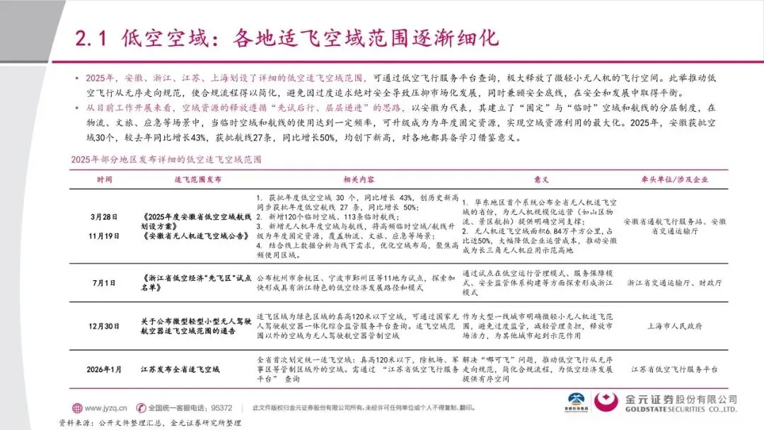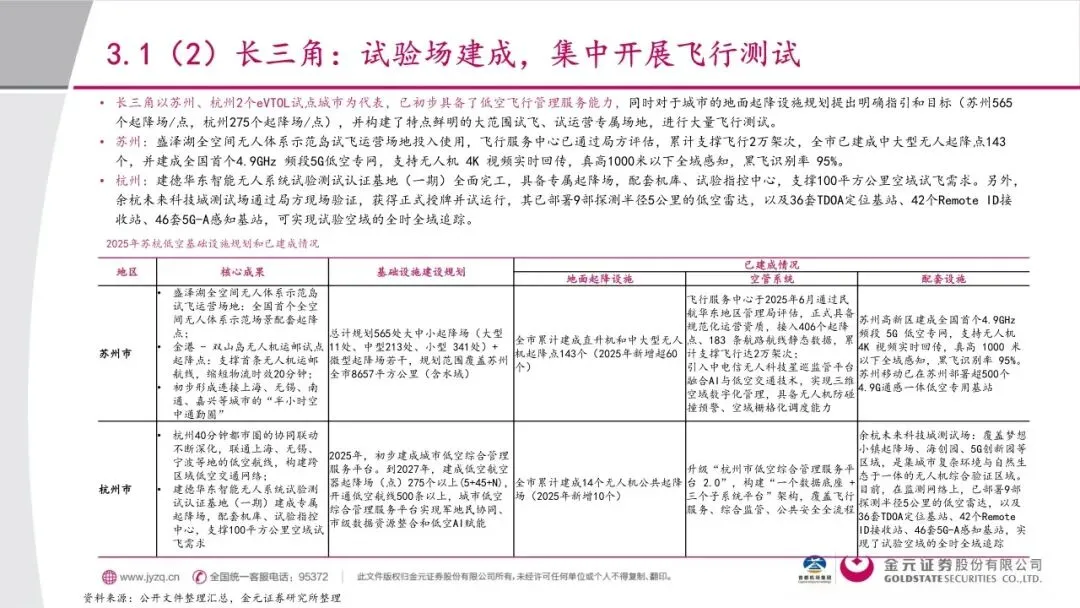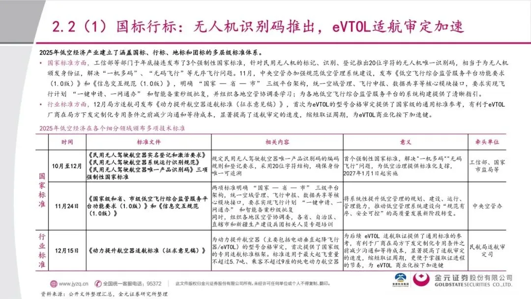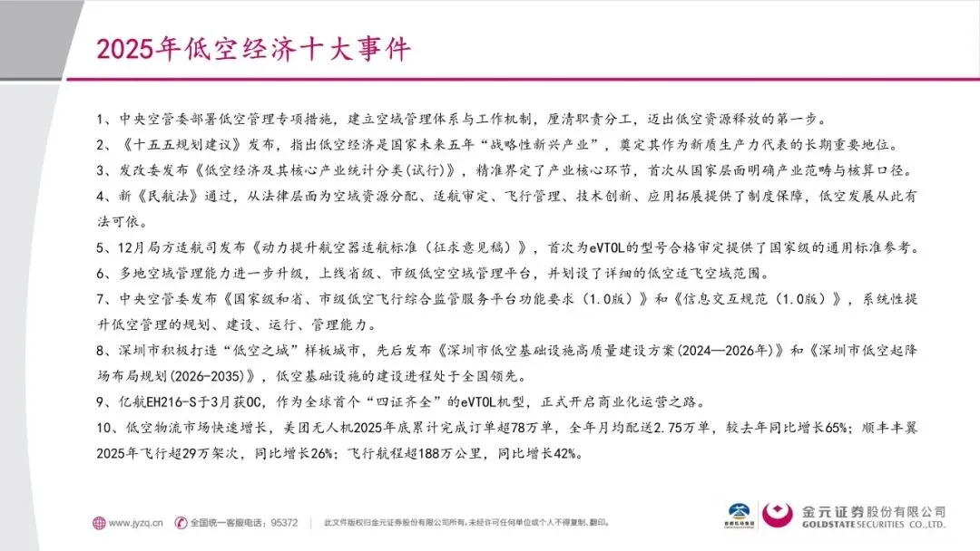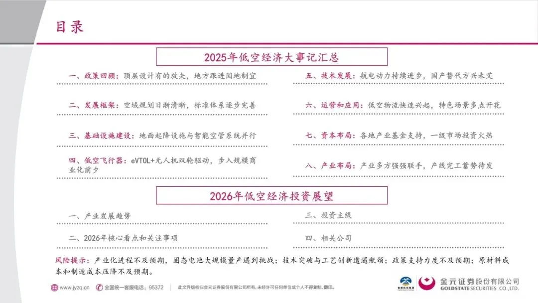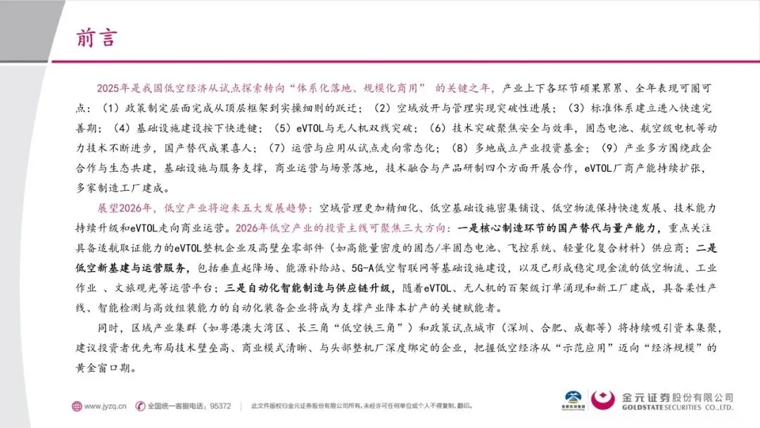展望2026年,低空产业将迎来五大发展趋势:空域管理更加精细化、低空基础设施密集铺设、低空物流保持快速发展、技术能力持续升级和eVTOL走向商业运营。2026年低空产业的投资主线可聚焦三大方向:一是核心制造环节的国产替代与量产能力,重点关注具备适航取证能力的eVTOL整机企业及高壁垒零部件(如高能量密度的固态/半固态电池、飞控系统、轻量化复合材料)供应商;二是低空新基建与运营服务,包括垂直起降场、能源补给站、5G-A低空智联网等基础设施建设,以及已形成稳定现金流的低空物流、工业作业 、文旅观光等运营平台;三是自动化智能制造与供应链升级,随着eVTOL、无人机的百架级订单涌现和新工厂建成,具备柔性产线、智能检测与高效组装能力的自动化装备企业将成为支撑产业降本扩产的关键赋能者。