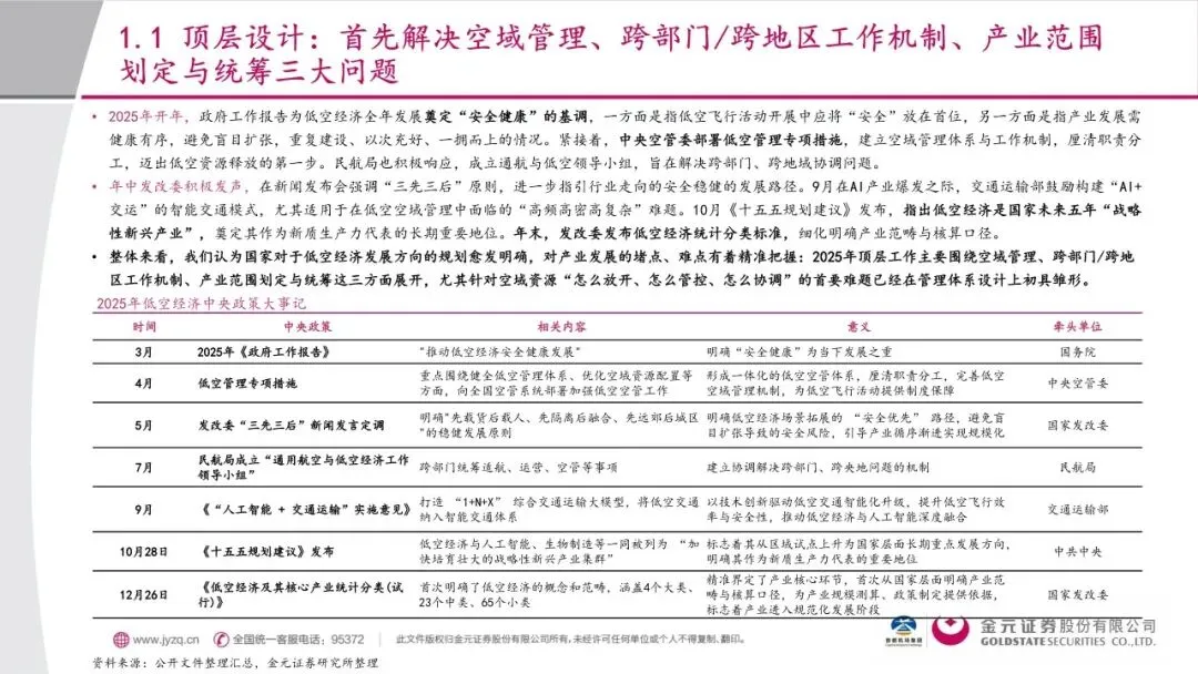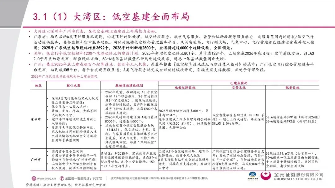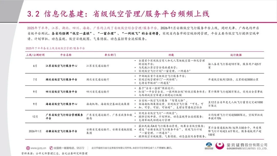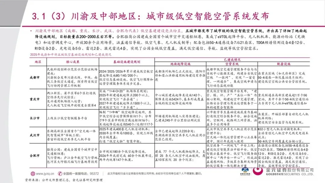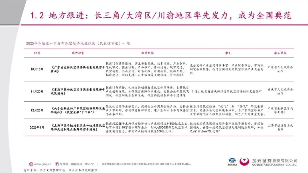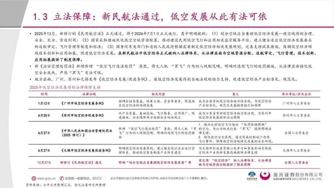 展望2026年,低空产业将迎来五大发展趋势:空域管理更加精细化、低空基础设施密集铺设、低空物流保持快速发展、技术能力持续升级和eVTOL走向商业运营。2026年低空产业的投资主线可聚焦三大方向:一是核心制造环节的国产替代与量产能力,重点关注具备适航取证能力的eVTOL整机企业及高壁垒零部件(如高能量密度的固态/半固态电池、飞控系统、轻量化复合材料)供应商;二是低空新基建与运营服务,包括垂直起降场、能源补给站、5G-A低空智联网等基础设施建设,以及已形成稳定现金流的低空物流、工业作业 、文旅观光等运营平台;三是自动化智能制造与供应链升级,随着eVTOL、无人机的百架级订单涌现和新工厂建成,具备柔性产线、智能检测与高效组装能力的自动化装备企业将成为支撑产业降本扩产的关键赋能者。