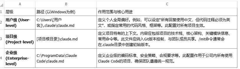 在这种模式下,开发者99%的代码都可以由AI生成。您的核心竞争力,体现在将业务问题转化为清晰技术规划的系统设计能力和问题分解能力上。claude.md 文件是Claude Code的“长期记忆”和“系统提示词”,是实现高质量上下文管理的核心。它通过分层设计,实现了从个人偏好到企业规范的全面覆盖。除了静态的claude.md,开发者还需掌握一套动态的上下文管理工具。正如专家所比喻的,将上下文管理视作“内存管理”,这是确保AI高效、专注工作的关键。- /init: 此命令会扫描整个项目的文件结构和内容,自动生成一份初始的 claude.md 文件。这是让AI快速建立对项目基础认知的起点。