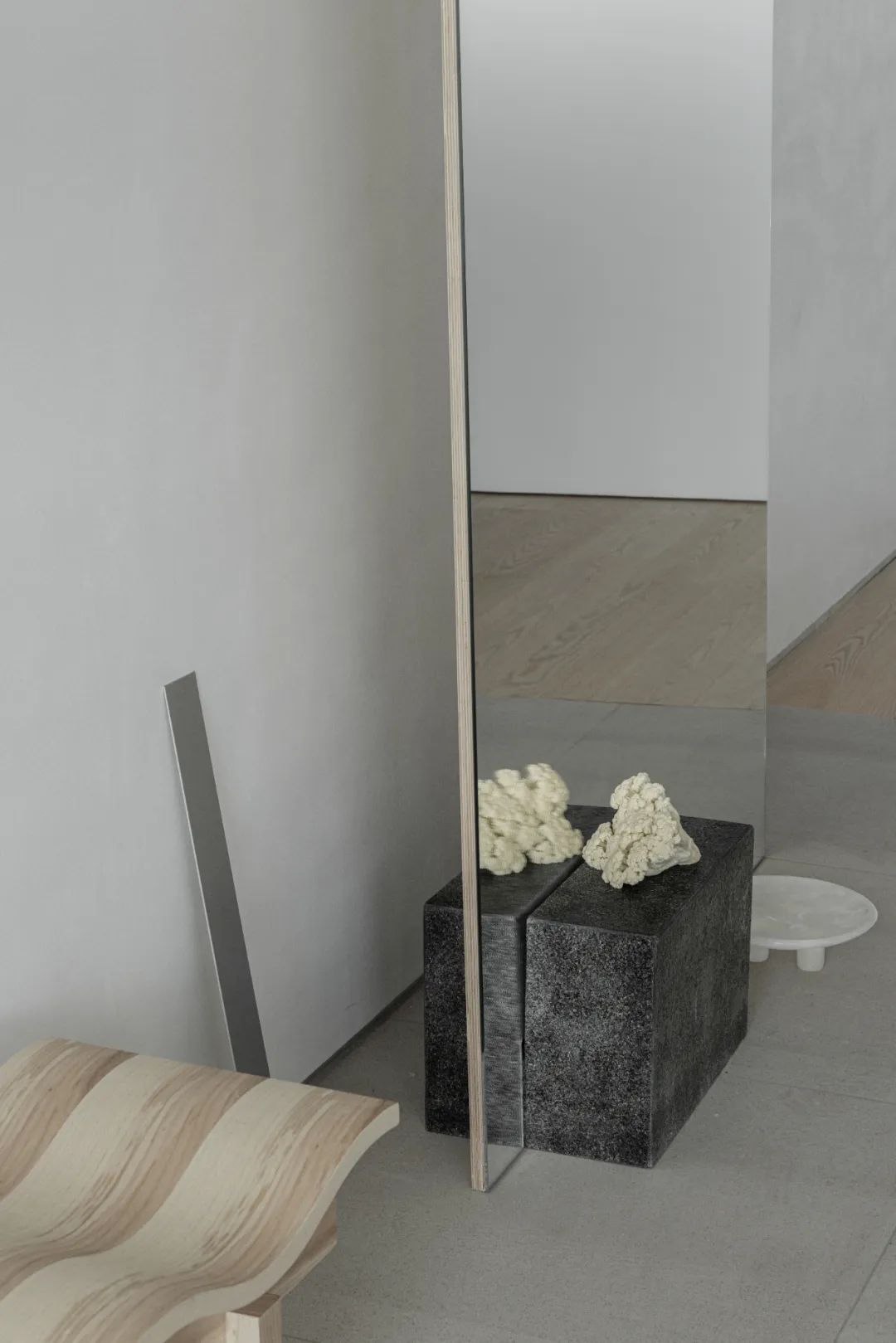设计团队尝试用深色木、白洞石、灰洞石白蜡木地板、棉麻布艺、摩卡石等一系列常见材质来营造质感,再以明亮轻盈的铝材作为媒介串联。用审美启发审美,服装买手透过自己对美的理解,转化为服装作为媒介、与消费者之间产生共鸣与关联。多材质之间的气质融合与统一,来营造微弱质感,赋予材料呈现被他者触动之感。