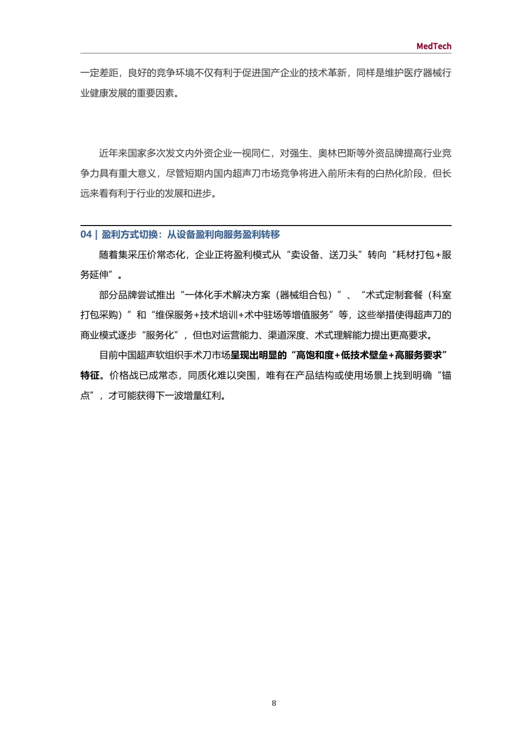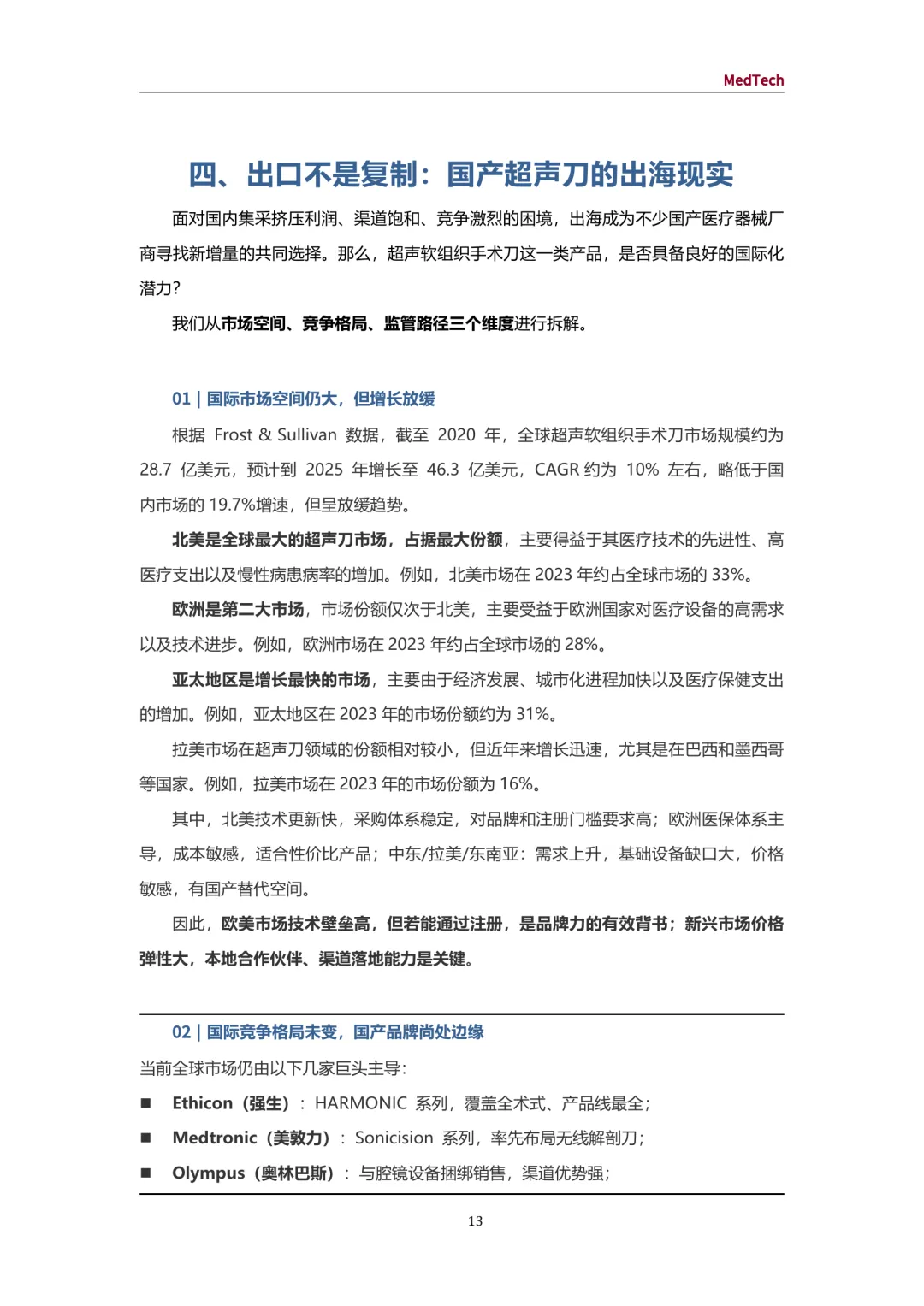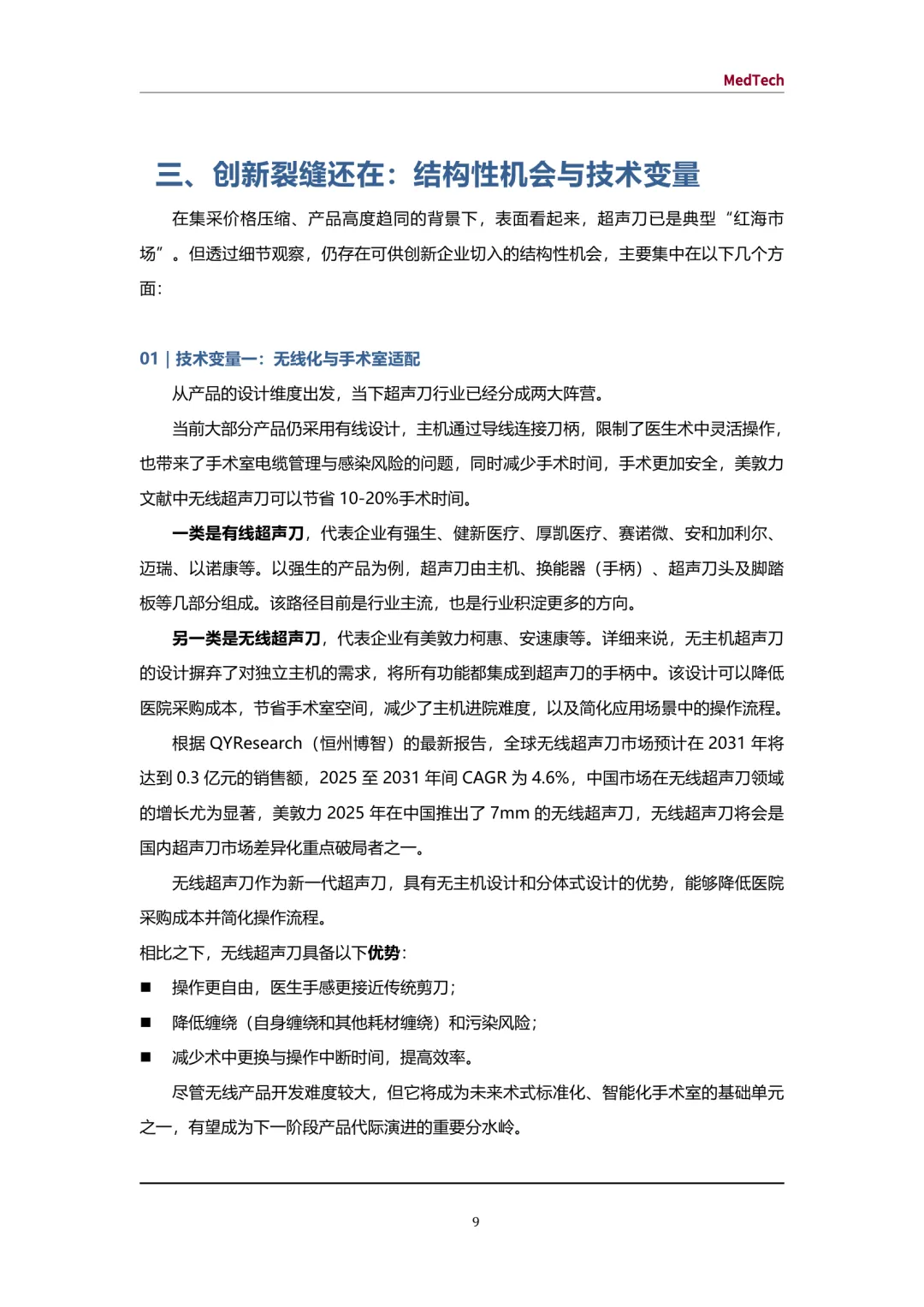 超声刀作为微创外科手术的核心基础设备,历经多年发展,已从进口垄断逐步实现国产替代。其在组织切割与止血方面发挥关键作用,显著提升手术效率和安全性,广泛应用于普外科、妇产科及泌尿外科等领域。行业发展可分为几个阶段:1990年代,以强生、奥林巴斯为代表的外资企业主导市场;2015年前后,速迈、瑞奇等国产品牌开始获得认证,国产替代启动;2020年起,多地推进刀头集采,价格体系调整,国产品牌市场份额快速扩大;2023年后,企业数量激增,产品注册频繁,行业竞争格局持续变化。超声刀市场进入成熟期,技术趋于同质化,价格被压缩,盈利模式面临转型。但结构性创新仍具潜力,如无线化、智能化、术式适配、服务型商业模式等,为行业带来新的增长点。同时,出口市场虽有空间,但面临国际竞争激烈、注册门槛高、合规成本大等挑战。面对行业现状,企业需聚焦技术差异化,探索适合自身的发展路径。在竞争加剧的背景下,具备长期投入能力、深入临床场景、掌握核心技术的企业更具优势。超声刀赛道虽不显眼,但其价值仍在,尤其在成熟市场中,仍有可挖掘的结构性机会。