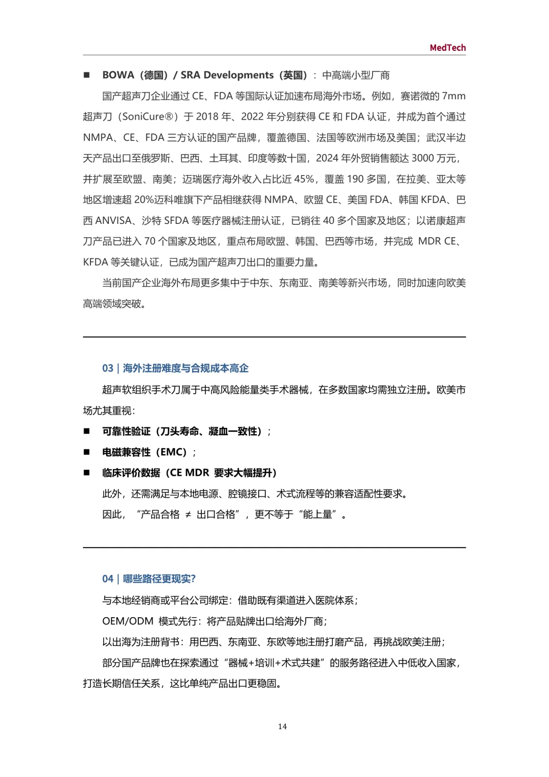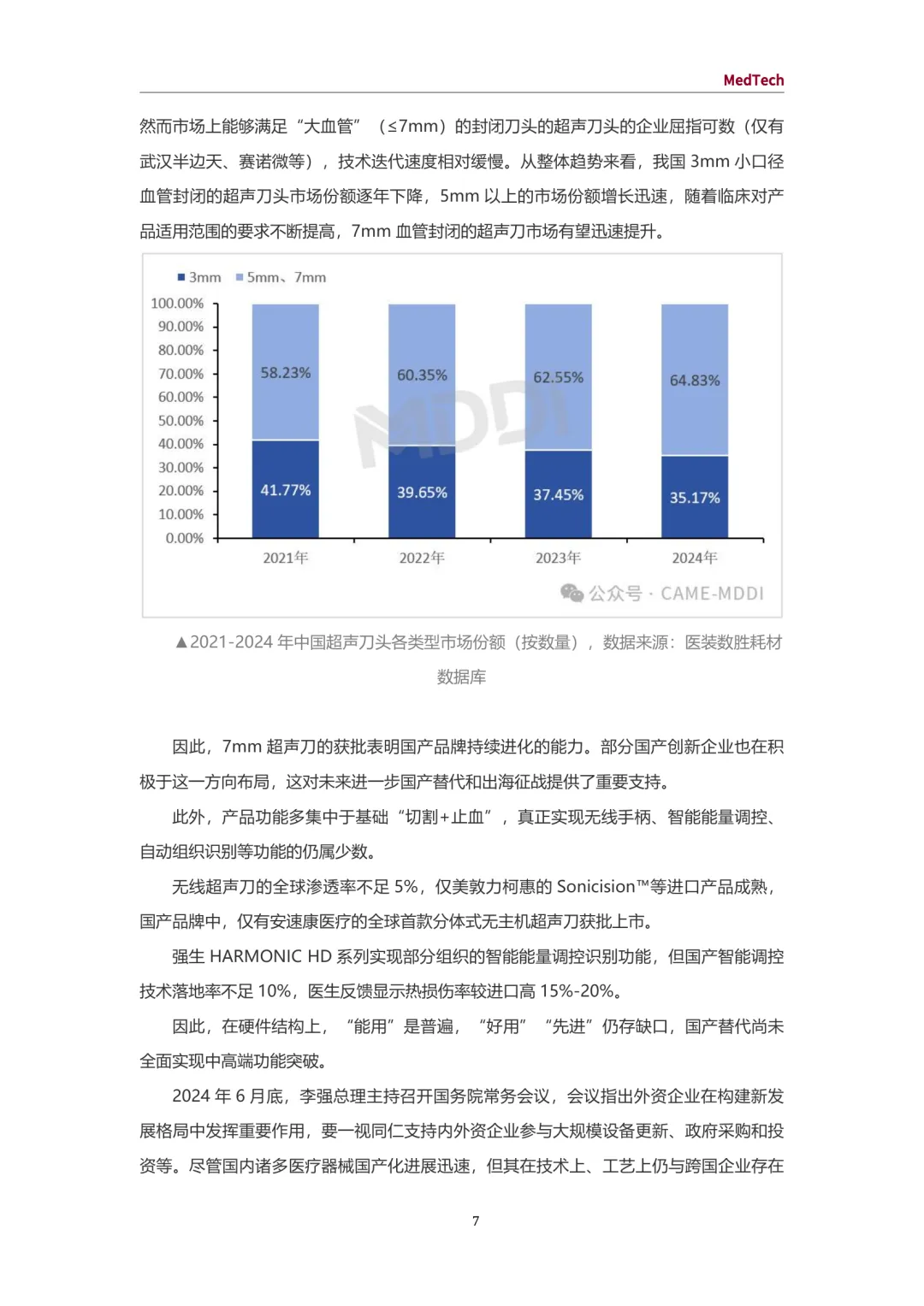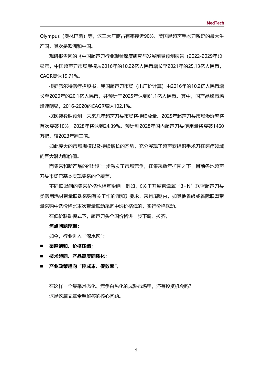 超声刀作为微创外科手术的核心基础设备,历经多年发展,已从进口垄断逐步实现国产替代。其在组织切割与止血方面发挥关键作用,显著提升手术效率和安全性,广泛应用于普外科、妇产科及泌尿外科等领域。行业发展可分为几个阶段:1990年代,以强生、奥林巴斯为代表的外资企业主导市场;2015年前后,速迈、瑞奇等国产品牌开始获得认证,国产替代启动;2020年起,多地推进刀头集采,价格体系调整,国产品牌市场份额快速扩大;2023年后,企业数量激增,产品注册频繁,行业竞争格局持续变化。超声刀市场进入成熟期,技术趋于同质化,价格被压缩,盈利模式面临转型。但结构性创新仍具潜力,如无线化、智能化、术式适配、服务型商业模式等,为行业带来新的增长点。同时,出口市场虽有空间,但面临国际竞争激烈、注册门槛高、合规成本大等挑战。面对行业现状,企业需聚焦技术差异化,探索适合自身的发展路径。在竞争加剧的背景下,具备长期投入能力、深入临床场景、掌握核心技术的企业更具优势。超声刀赛道虽不显眼,但其价值仍在,尤其在成熟市场中,仍有可挖掘的结构性机会。