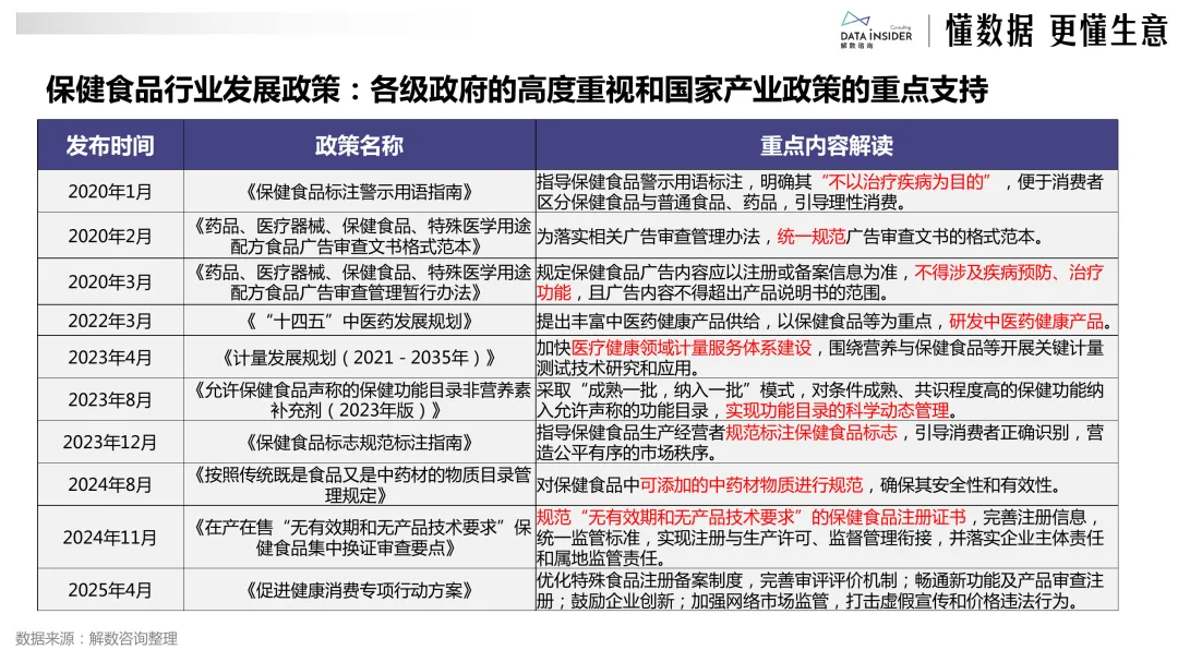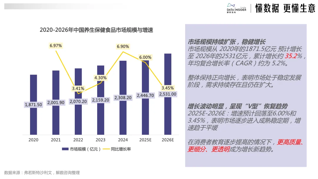 2025年保健食品市场政策持续完善,政府对行业高度重视,多项政策出台推动行业发展规范化。2020年至2025年间,相关政策逐步细化,涵盖警示用语标注、广告审查、功能目录管理、标志规范及中药材使用等方面,旨在提升产品透明度,引导消费者理性消费,维护市场秩序。2023年发布的《允许保健食品声称的保健功能目录非营养素补充剂(2023年版)》采取动态管理机制,推动功能声明科学化。2024年8月实施的中药材目录管理规定,进一步规范保健食品中可添加的中药材,确保安全性和有效性。2025年4月推出的《促进健康消费专项行动方案》,则聚焦于优化注册备案制度,鼓励企业创新,强化网络市场监管。市场规模方面,2020年达到1871.5亿元,预计到2026年将增至2531亿元,五年间增长约35.2%,复合增长率约为5.2%。整体呈现稳健增长态势,但增速在2025年和2026年预计将回落至6%和3.45%,表明市场逐步进入成熟阶段,增长趋于平稳。随着消费者认知水平提升,市场对高质量、细分化、透明化的产品需求增强,成为未来发展的主要方向。