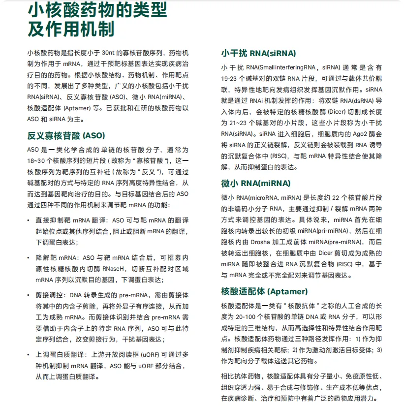 主要分为反义寡核苷酸(ASO)、小干扰RNA(siRNA)、微小RNA(miRNA)、核酸适配体(Aptamer)等类型,目前开发程度最高的小核酸药物为ASO和siRNA。小核酸