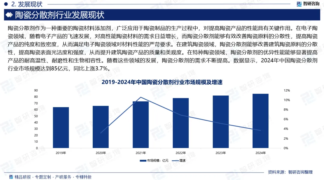 陶瓷分散剂,又称稀释剂或解凝剂,是陶瓷添加剂中的重要一类。其主要功能是协助控制陶瓷浆料的流变性质,确保陶瓷颗粒在浆料中能够均匀分散,并维持稳定状态。陶瓷分散剂广泛应用于陶瓷制品的生产过程中,对提高陶瓷产品的性能具有关键作用。在电子陶瓷领域,随着电子产品的飞速发展,对高性能陶瓷材料的需求日益增长,而陶瓷分散剂能够有效改善陶瓷原料的分散性,提高陶瓷产品的纯度和致密度,从而满足电子陶瓷领域对材料性能的严苛要求。在建筑陶瓷领域,陶瓷分散剂能够改善建筑陶瓷原料的分散性,提高陶瓷表面光洁度和强度,从而提升建筑陶瓷产品的质量和美观度。在特种陶瓷领域,陶瓷分散剂的优异性能能够显著提高产品的耐高温性、耐磨性和生物相容性。随着这些领域的发展,陶瓷分散剂的需求不断提高。数据显示,2024年中国陶瓷分散剂行业市场规模达到85亿元,同比上涨3.7%。