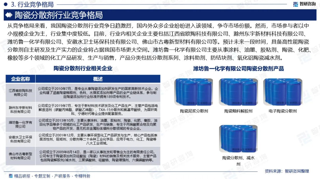 企业格局:从竞争格局来看,我国陶瓷分散剂行业竞争日趋激烈,国内外众多企业纷纷进入该领域,争夺市场份额。然而,市场参与者以中小规模企业为主,行业集中度较低。目前,行业内相关企业主要包括江西省欧陶科技有限公司、滁州东宇新材料科技有限公司、潍坊鲁一化学有限公司、安徽水卫士环保科技有限公司、佛山市古粤新型材料有限公司等。预计未来一段时间,具备高性能陶瓷分散剂自主研发及生产实力的企业将占据我国市场更大空间。