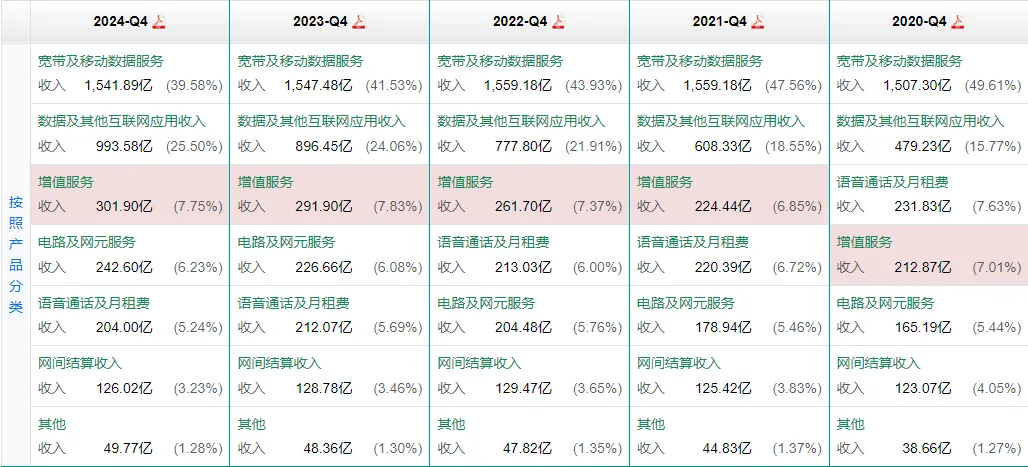 宽带及移动数据服务:这个很容易理解,就是家里或企业拉的宽带和手机流量等的收入。