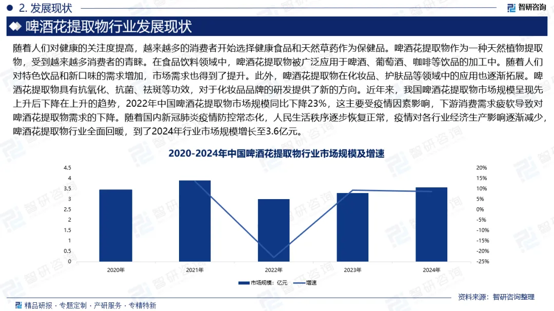 啤酒花提取物是指从啤酒花中提取得到的一种天然植物提取物。它富含α-酸、黄酮类化合物、多酚等活性物质,具有抗肿瘤、抗氧化、抗菌、消除体内自由基等功能,可将其作为食品添加剂防止食物的腐败,并且可用于医药、化妆品、保健食品和食品的抗氧化剂。随着人们对健康的关注度提高,越来越多的消费者开始选择健康食品和天然草药作为保健品。啤酒花提取物作为一种天然植物提取物,受到越来越多消费者的青睐。在食品饮料领域中,啤酒花提取物被广泛应用于啤酒、葡萄酒、咖啡等饮品的加工中。随着人们对特色饮品和新口味的需求增加,市场需求也得到了提升。此外,啤酒花提取物在化妆品、护肤品等领域中的应用也逐渐拓展。啤酒花提取物具有抗氧化、抗菌、祛斑等功效,对于化妆品品牌的研发提供了新的方向。近年来,我国啤酒花提取物市场规模呈现先上升后下降在上升的趋势,2022年中国啤酒花提取物市场规模同比下降23%,这主要受疫情因素影响,下游消费需求疲软导致对啤酒花提取物需求的下降。随着国内新冠肺炎疫情防控常态化,人民生活秩序逐步恢复正常,疫情对各行业经济生产影响逐渐减少,啤酒花提取物行业全面回暖,到了2024年行业市场规模增长至3.6亿元。