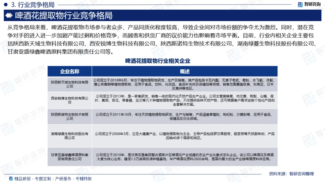 企业格局:啤酒花提取物市场参与者众多、产品同质化程度较高,导致企业间对市场份额的争夺尤为激烈。同时,潜在竞争对手的进入进一步加剧产能过剩和价格竞争,而顾客和供货厂商的议价能力也影响着市场平衡。目前,行业内相关企业主要包括陕西新天域生物科技有限公司、西安锐博生物科技有限公司、陕西斯诺特生物技术有限公司、湖南绿蔓生物科技股份有限公司、甘肃亚盛绿鑫啤酒原料集团有限责任公司等。