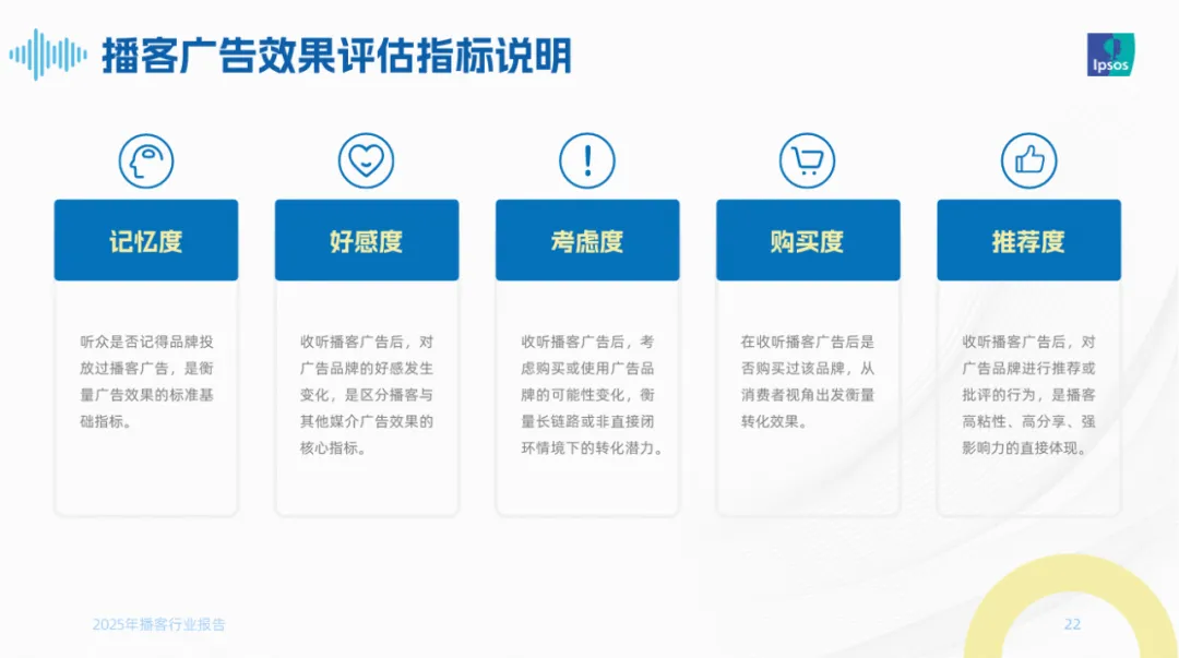 《报告》指出,播客广告在商业化过程中依然面临“转化效果难追踪、品牌效果易被低估”的挑战。针对这一痛点,益普索基于3i品牌增长路径,结合品牌方、平台方、主播与听众反馈,建立了更契合播客特性的广告效果评估体系,涵盖记忆度、好感度、考虑度、购买度、推荐度五个维度,能够以更加直观、可衡量的方式展示播客广告的直接转化效果和品牌影响力提升效果。