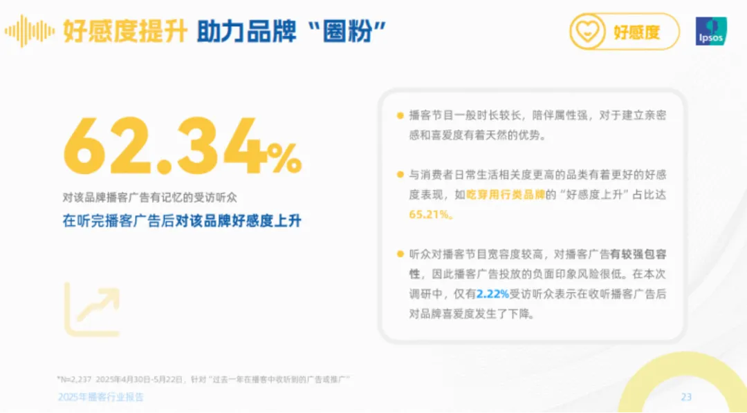 根据该播客广告效果评估体系调研,在对品牌播客广告有记忆的受访听众中,62.34%在听完播客广告后对该品牌好感度提升;61.39%表示考虑购买该品牌/产品的可能性提升,48.75%曾购买过该品牌/产品,对品牌/产品的净推荐比例高达58.59%。值得注意的是,播客节目由于通常以存档形式存在,听众可以在节目发布后的数月甚至数年内随时收听,广告也会随着节目被反复收听持续触达新听众,获得更为深远的效果。