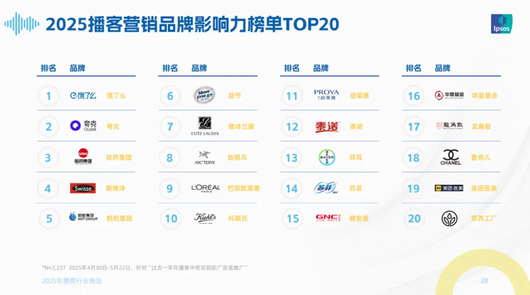 本次《报告》还评选出了“2025播客营销品牌影响力榜单Top20”,以高频消费类品牌(如外卖、饮品等)、保健品牌、科技互联网品牌为主。其中,饿了么、夸克、雅诗兰黛、巴黎欧莱雅、华夏基金、美团医美都同喜马拉雅保持着合作关系。