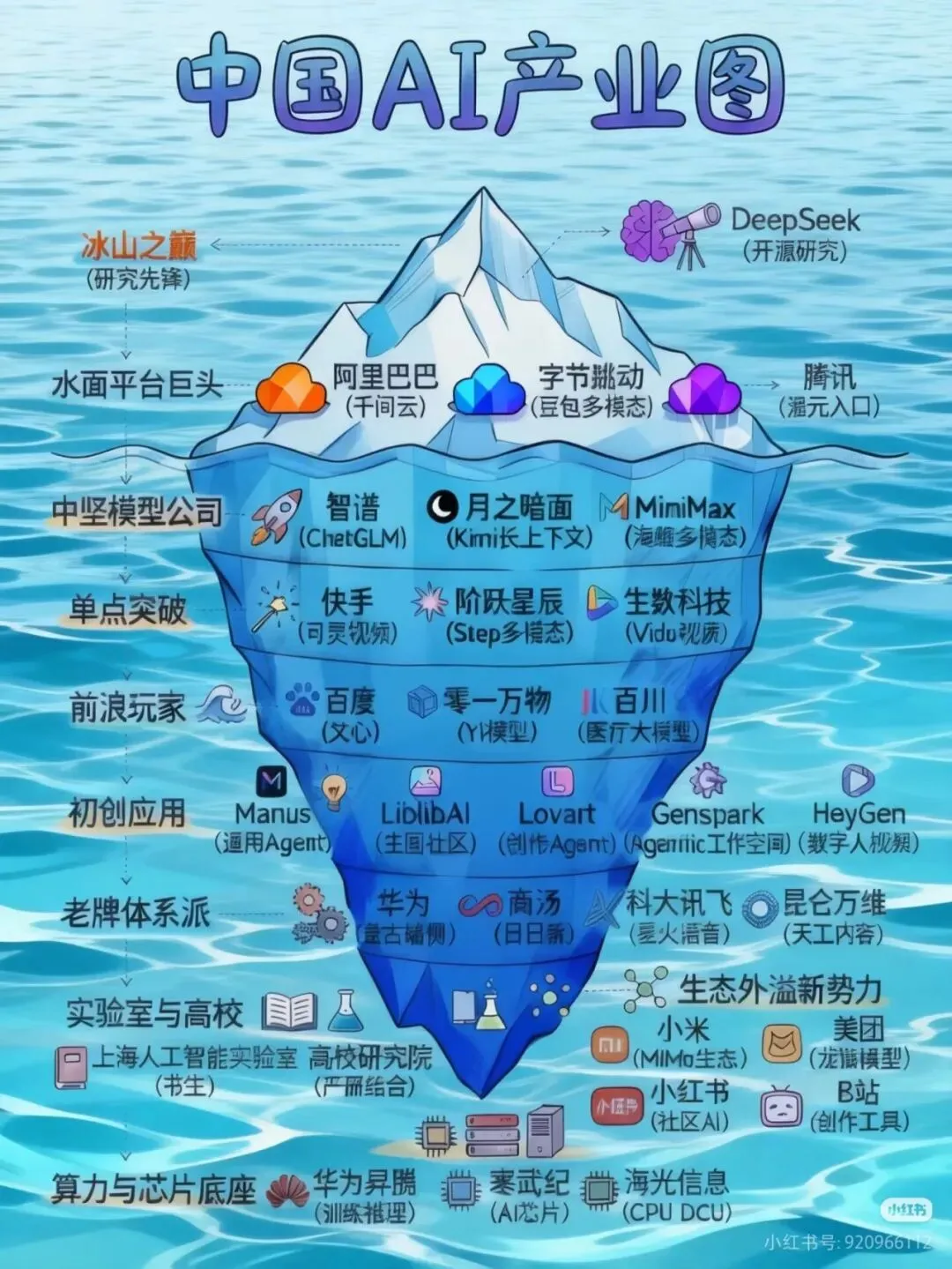 百度是国内最早且最坚定投入 AI 的巨头,其战略核心是 "云智一体",通过百度智能云将 AI 能力输出给千行百业。文心大模型作为百度 AI 战略的皇冠,已迭代至文心 4.0 版本,具备更强的理解、生成、推理和记忆能力。其特点是知识增强,与百度搜索引擎的海量知识库深度融合,在中文理解和事实准确性上具有一定优势。百度的技术全栈布局优势明显,从底层芯片(昆仑芯)、框架(飞桨)、模型(文心)到上层应用,形成了完整的技术体系,自主可控性强。同时,搜索引擎积累的万亿级网页和知识图谱,为文心大模型提供了丰富的 "养料"。在 B 端市场,百度凭借深厚的政府和企业客户关系,在智慧城市、智能制造等领域落地了大量案例。然而,百度也面临一些挑战。与腾讯、阿里相比,百度缺乏现象级的 C 端超级 App 作为流量入口和 AI 应用试验田;长期的 AI 投入带来巨大的财务压力,市场对其盈利能力和回报率有较高期待;在生成式 AI 领域,面临来自国内外众多对手的激烈竞争,先发优势正在被追赶。阿里的 AI 战略紧密围绕其核心商业生态和阿里云展开,强调 "AI 驱动商业"。通义千问大模型是阿里旗下核心大模型,其最大特点是与阿里电商、文娱、办公等业务的深度集成,例如在淘宝天猫中用于商品描述生成、客服机器人等。阿里的优势在于拥有电商、支付、物流、文娱等庞大的业务生态,为 AI 技术提供了绝佳的试验田和海量数据。阿里云作为国内云市场领头羊,为 AI 模型的训练和推理提供了强大的算力保障和天然的销售渠道。魔搭社区作为国内规模最大的模型即服务社区,聚合了来自各界的大量开源模型,构建了开放生态。在商业化能力方面,AI 技术已直接服务于阿里的核心电商和广告业务,商业模式清晰。2025 财年阿里云收入达到 1180 亿元,同比增幅达到 11%,充分体现了 AI 技术对业务的推动作用腾讯的 AI 战略相对务实和内敛,核心是 "AI in All",将 AI 作为赋能工具,深度融合到其现有的产品和社交体系中。混元大模型是腾讯全链路自研的通用大模型,已全面覆盖文生文、文生图、文生视频等多模态能力,其最大优势是深度集成于微信、QQ、游戏、腾讯广告等核心产品。腾讯拥有无与伦比的用户与场景优势,微信和 QQ 两大社交平台提供了十亿级的用户触达和极其丰富的社交、支付、内容消费场景。同时,腾讯在产品化能力方面极强,擅长将技术转化为用户喜爱的产品,AI 能力能快速、平滑地集成到现有 App 中,用户体验顺畅。在数据多样性方面,社交、游戏、内容、金融等数据维度丰富,为多模态大模型训练提供了独特优势。华为的 AI 战略是其整体 ICT 战略的延伸,核心是 "AI for Industries",强调硬件优势与产业结合。昇腾 AI 芯片 & Atlas 系列基于自研的达芬奇架构,提供从芯片到服务器、集群的全栈 AI 算力解决方案,是其最核心的竞争力。华为的优势在于硬核技术实力,在芯片、硬件、算力基础设施上拥有绝对优势,尤其在 "AI 算力国产化" 背景下地位关键。同时,华为拥有深厚的 B 端和 G 端客户关系,长期服务全球运营商和大型政企客户,对行业需求理解深刻,信任度高。在软硬一体化协同方面,从芯片、框架到模型的全栈优化,能带来极致的性能和能效。盘古大模型避开通用领域的红海竞争,聚焦气象、矿山、药物分子等垂直行业,直击行业核心痛点,价值主张清晰。2025 年,华为在政企市场的 AI 相关营收突破 300 亿元,同比增长 45%。4.3 产业链竞争态势