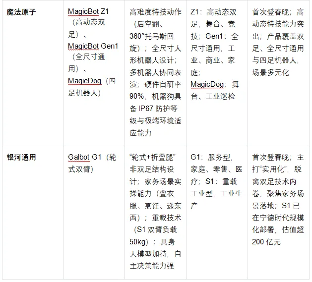 2026年春晚亮相的宇树科技、松延动力、魔法原子、银河通用四家企业,代表了人形机器人行业的四大技术方向,各企业核心竞争力与产品布局差异显著,具体对比如下: