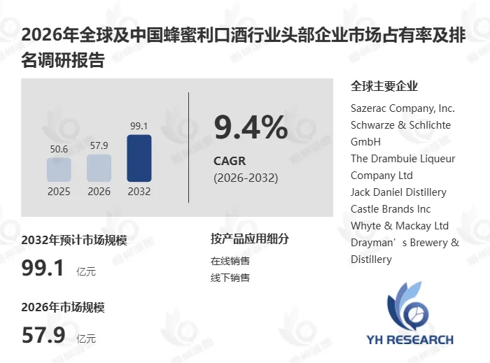 根据YH恒州诚思信息咨询调研统计,2025年全球蜂蜜利口酒市场规模约50.61亿元,预计未来将持续保持平稳增长的态势,到2032年市场规模将接近99.1亿元,未来六年CAGR为9.4%。