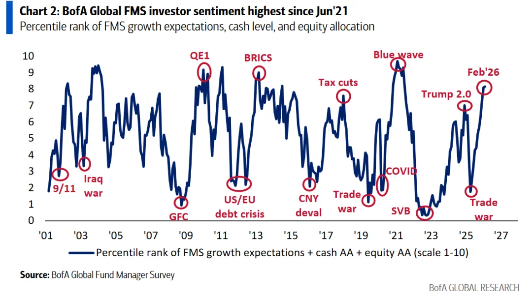 核心提要:美银最新全球基金经理调查显示(发布于2026 年 2 月 17 日),全球投资者情绪升至 2021 年 6 月以来的极致看涨水平,“No Landing” 成为全球经济的主流预期,大宗商品、新兴市场等资产获大幅加仓。但仓位高度拥挤、企业过度投资、AI 泡沫风险隐现等问题凸显,美银牛熊指标持续发出逆向卖出信号,一季度资产价格上行难度显著加大,市场正迎来新一轮的结构轮动与风险考验。