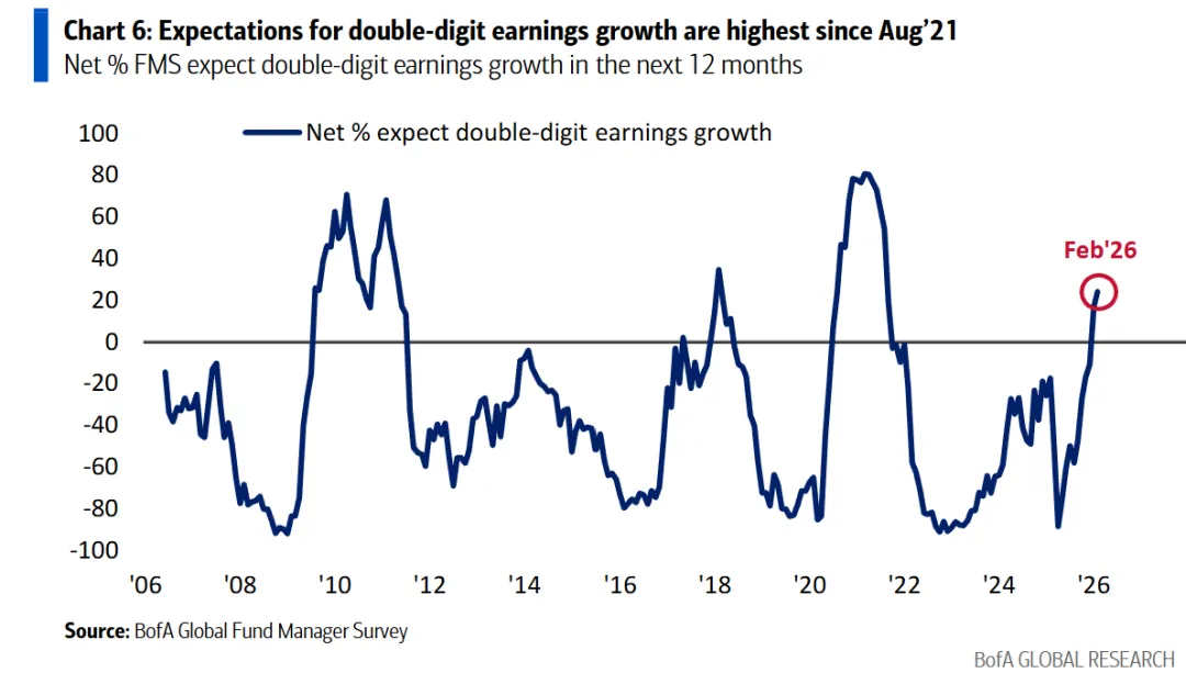 同时,投资者对经济 “繁荣”(高于趋势的增长 + 通胀)的预期升至 36%,创 2022 年 2 月以来新高;对全球企业双位数 EPS 增长的乐观预期升至 24%,为 2021 年 8 月以来最高水平,39% 的投资者预期全球经济将走强,较 1 月小幅提升。