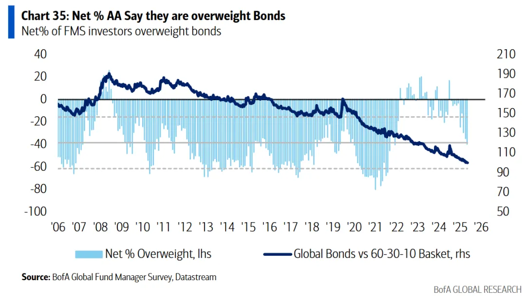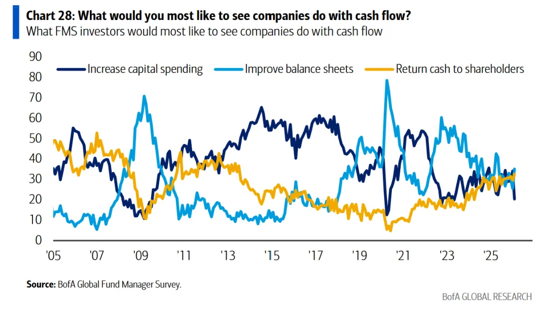 与经济乐观预期形成反差的是,投资者对企业 “过度投资” 的担忧达到历史峰值,这也使得机构对企业现金流的使用方向出现明显转变。35% 的 CIO 建议企业优先改善资产负债表,较前期的 26% 大幅提升;而建议增加资本支出的比例从 34% 降至 20%,仅 33% 的投资者希望企业将现金流返还股东。在高投资、高杠杆的背景下,市场对企业盈利的可持续性开始持谨慎态度。