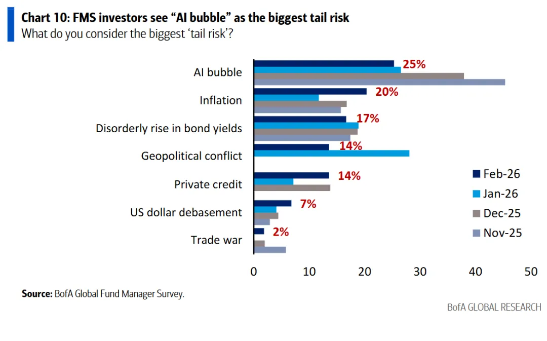 本次调查中,投资者对政策走向的判断和风险点的认知高度一致,AI 泡沫、私人信贷风险、拥挤交易成为当前市场最核心的三大担忧。