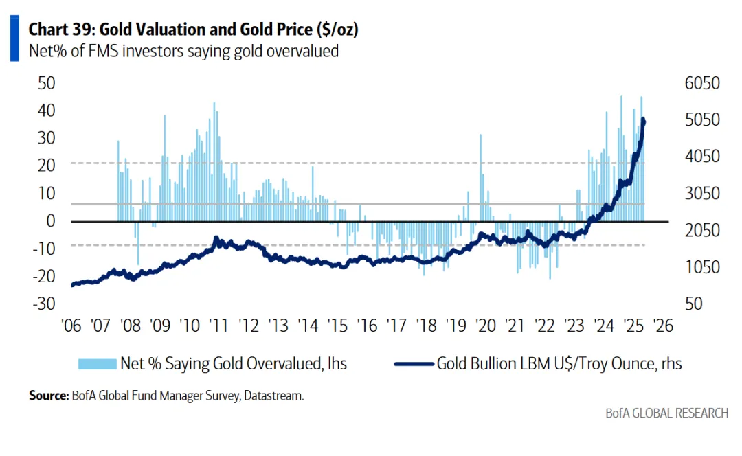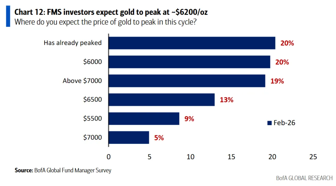 43% 的投资者认为私人股权 / 私人信贷是系统性信用事件的最可能来源,30% 指向 AI 超大规模资本支出,信用风险的关注点从传统领域转向另类金融和科技赛道。 而交易层面,做多黄金连续两月成为最拥挤交易,50% 的投资者认可这一观点,远超做多七大科技巨头(20%)、做空美元(12%)等选项;同时投资者对黄金峰值的加权平均预期达 6200 美元 / 盎司,较当前水平高 23%,黄金的单边上涨行情已积累大量获利盘。