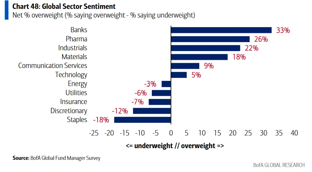 在仓位高度拥挤、情绪极致看涨的背景下,美银基于调查结果给出了明确的逆向交易策略,核心逻辑为 “反向布局拥挤交易,把握被错杀的资产”,具体的配对交易建议为:做多债券 - 做空黄金、做多美元 - 做空新兴市场、做多科技 - 做空银行、做多 REITs - 做空材料。