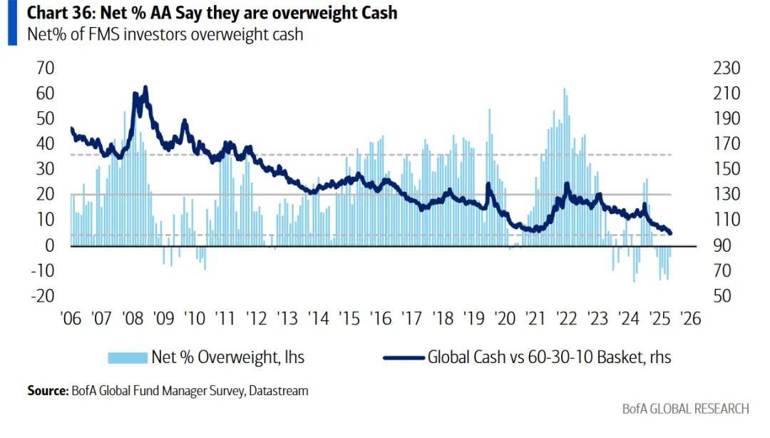同时,美银的两大核心逆向指标均提示风险:现金规则显示,当现金仓位低于 4% 时需卖出股票,当前 3.4% 仍处于卖出区间;牛熊指标显示,当指标高于 8.0 时为卖出信号,当前 9.5 的读数意味着市场已处于超买状态,建议投资者在一季度降低风险敞口。