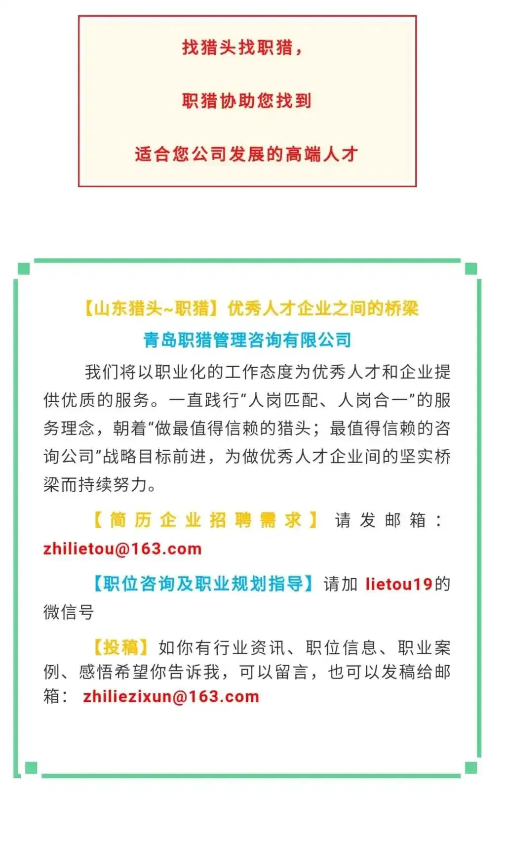 我与我的团队,专注为企业提供组织架构优化、人才盘点与梯队建设、高端人才猎聘、AI人才适配、薪酬绩效设计、用工风险管控、长期激励规划、HR体系升级等一站式人才战略服务。我们不做空洞的理论咨询,只做落地、见效、能为企业创造价值的实战解决方案;我们不做粗放的人才招聘,只做精准、匹配、能长期稳定的高端人才猎聘。