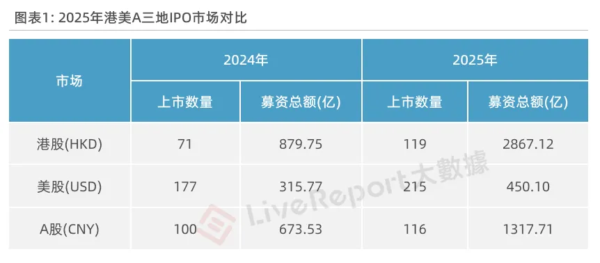 A股市场有116家新股IPO上市,同比增长16%;合计募资1318亿元人民币,同比增长95.6%。A股新股市场开始逐步回暖,IPO企业集中于战略性新兴产业,多家半导体明星企业接连登场,反响热烈,此外多家商业航天领域的企业正在筹备上市,有望在2026年形成上市热潮。
