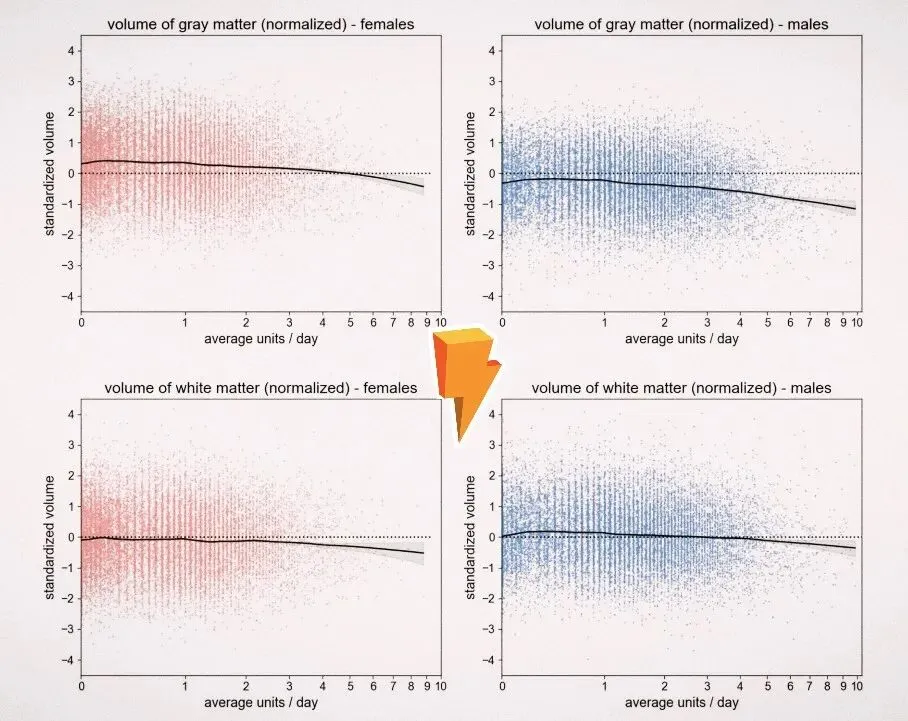 酒精摄入量和脑容量减少之间,呈明显正相关。