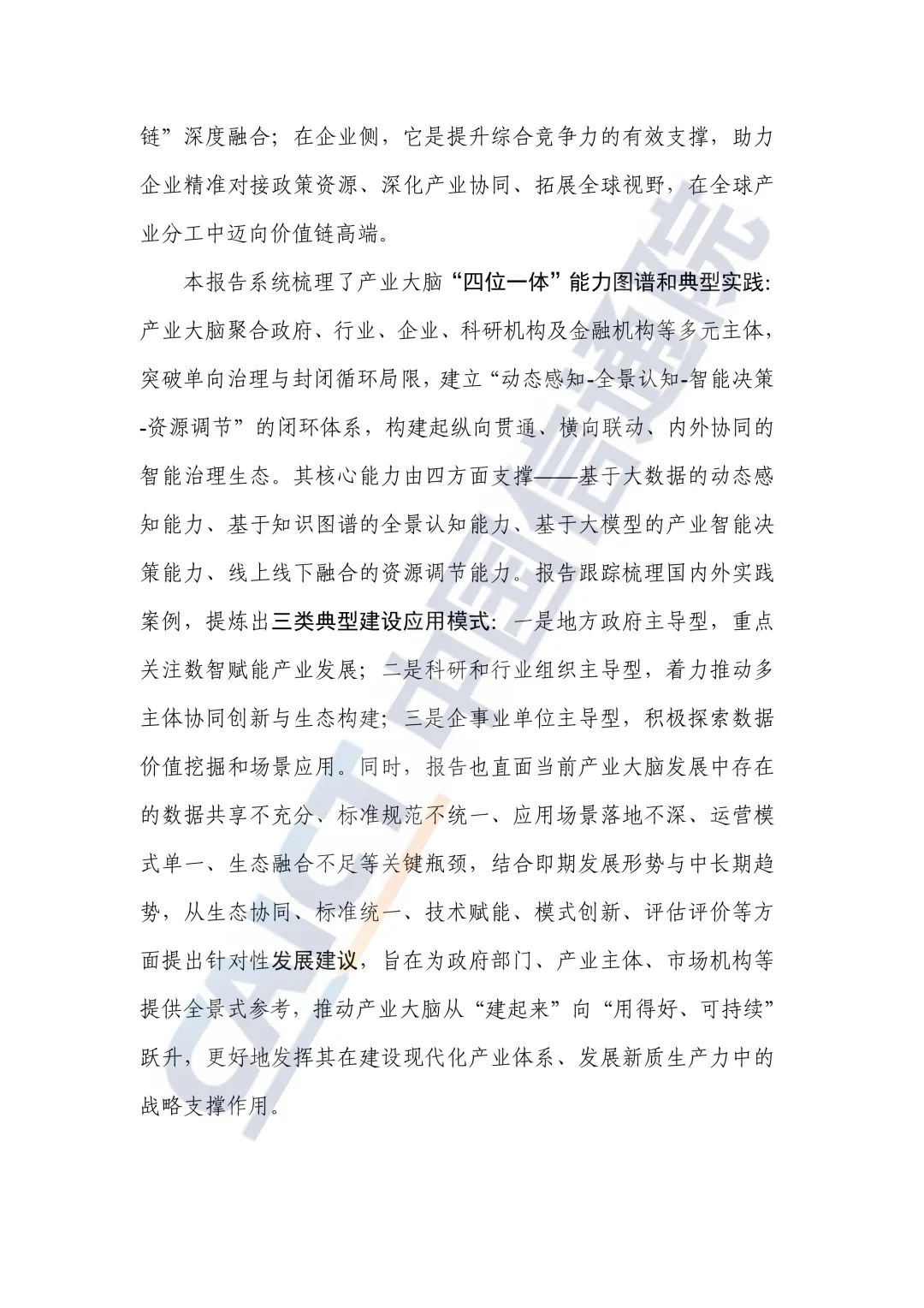 报告开篇即明确了其时代背景:服务于“建设现代化产业体系”、“发展新质生产力”的国家战略。在此背景下,产业大脑被定位为连接政府治理与产业运行的关键枢纽,是推动数实融合、增强产业链韧性的核心载体。因此,本报告并非单纯的技术探讨,而是一份兼具战略高度、实践深度和问题导向的政策研究与产业指南,旨在为政府部门、产业主体和市场机构提供全景式参考,推动产业大脑从“建起来”向“用得好、可持续”跃升。