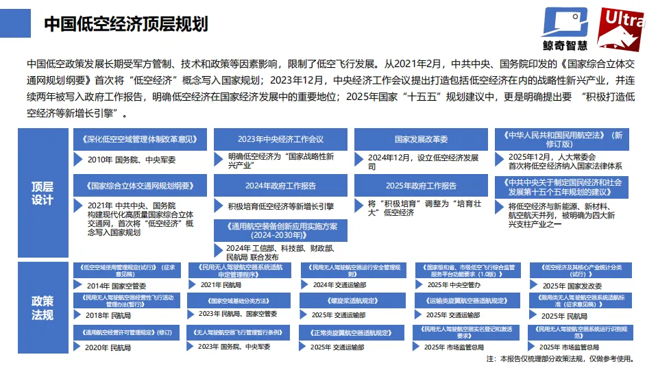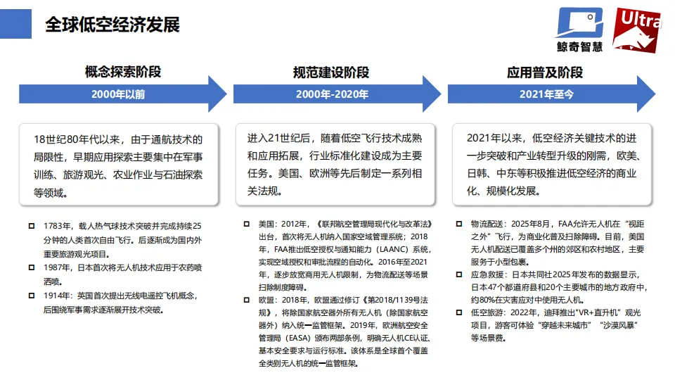 核心赛道中,无人机仍是当前主力,预计2025年全球市场规模为2202亿元,中国市场规模为1452亿元,工业级无人机占比为68%,技术向AI赋能、长续航升级,应用朝行业一体化、消费工具化发展;eVTOL是未来重点,预计2025年全球市场规模为158.2亿美元,中国市场规模为57.5亿元,聚焦载人和载物场景,关键技术突破(如能量密度、快充)与适航认证加速推进商业化。