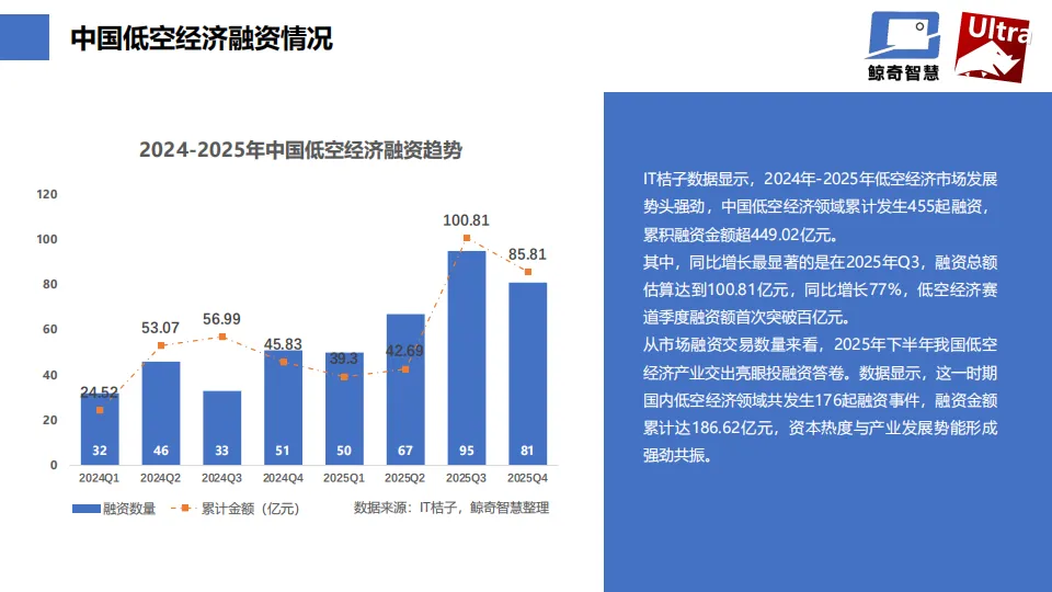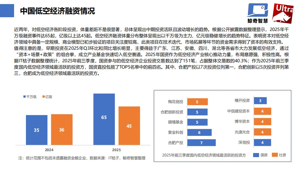低空经济是以先进飞行器为载体,依托新型基建与空域管理,融合多产业的三维经济形态,涵盖生产作业、公共服务、交通运输、消费活动四大场景。2025年中国低空经济规模预计将达8519亿元,同比增28.2%,2026年将破万亿元。2024年-2025年累计融资事件455起,融资金额超449.02亿元,国资参与度达40.3%。