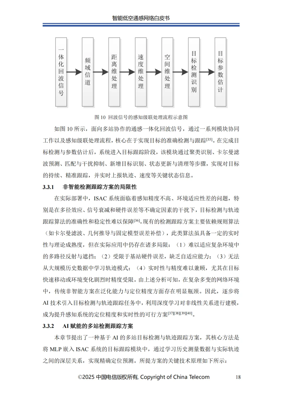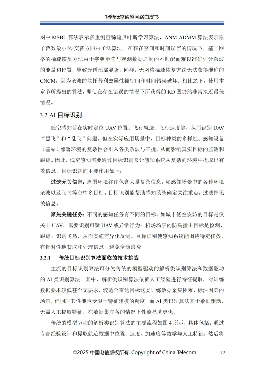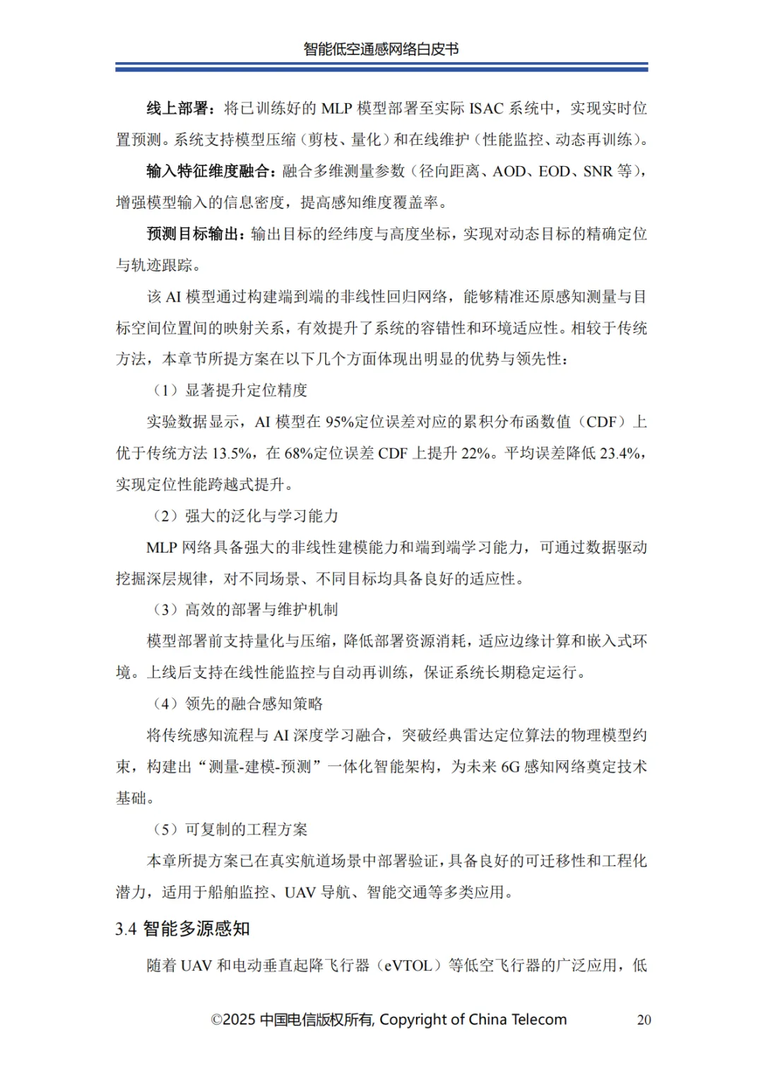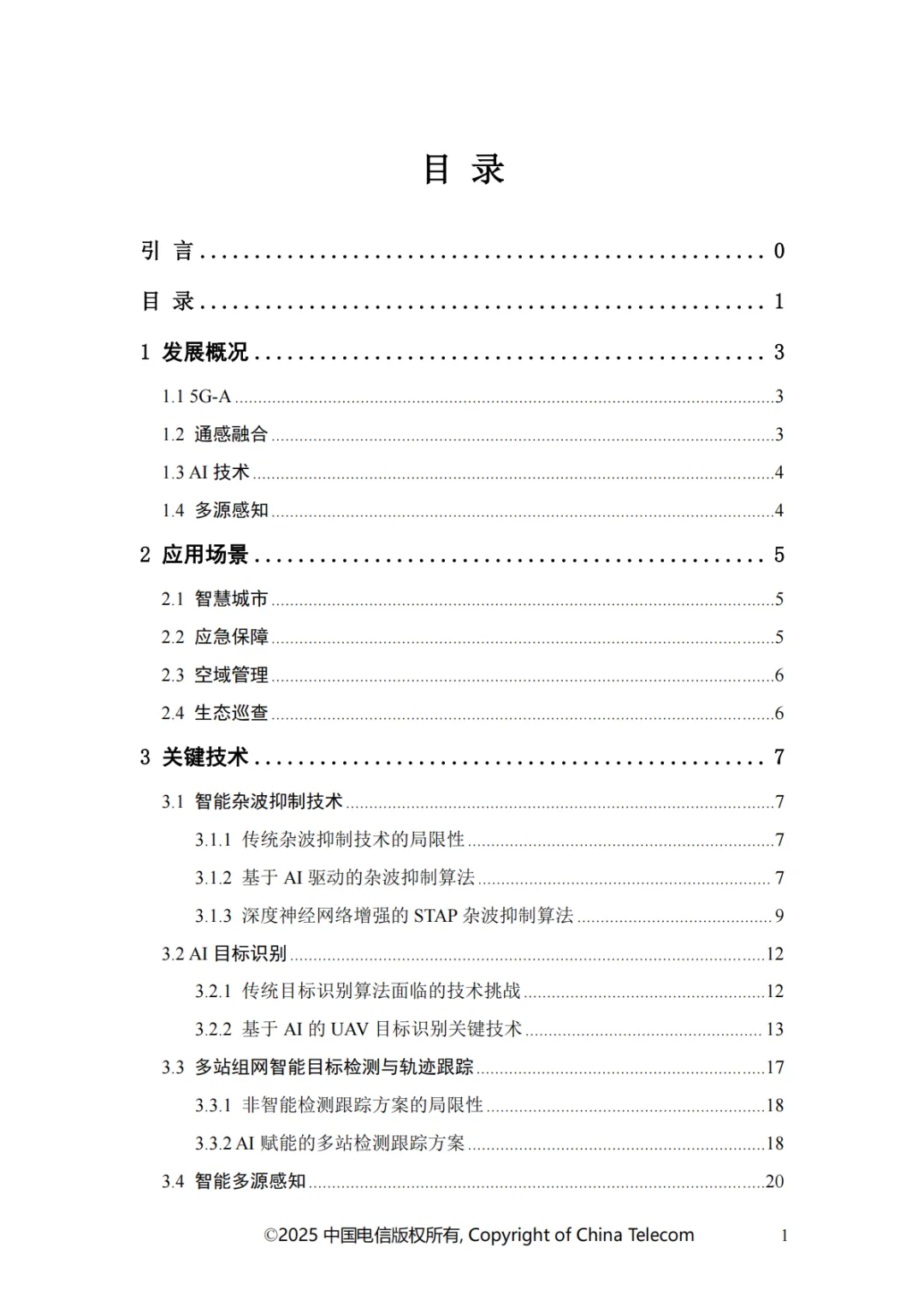 本白皮书首先阐述了智能低空通感网络的发展概况;其次介绍了智能低空通感网络的多种应用场景;随后针对应用场景所需的关键能力,分析了传统非智能通感技术面临的问题与挑战,进而提出创新性解决方案;在杂波抑制方面,提出了融合 AI 技术与传统算法的深度神经网络增强的空时自适应处理(STAP)算法,以实现智能杂波抑制;针对目标识别的难题,介绍了基于 AI 的 UAV 目标识别关键技术,保障对目标的精准识别;为应对目标检测与轨迹跟踪的挑战,提出了AI 赋能的多站检测跟踪方案;此外,还创新性地提出了一种多源感知融合技术架构,有效提升了低空感知的可靠性;最后对智能低空通感网络的未来发展进行总结与展望。