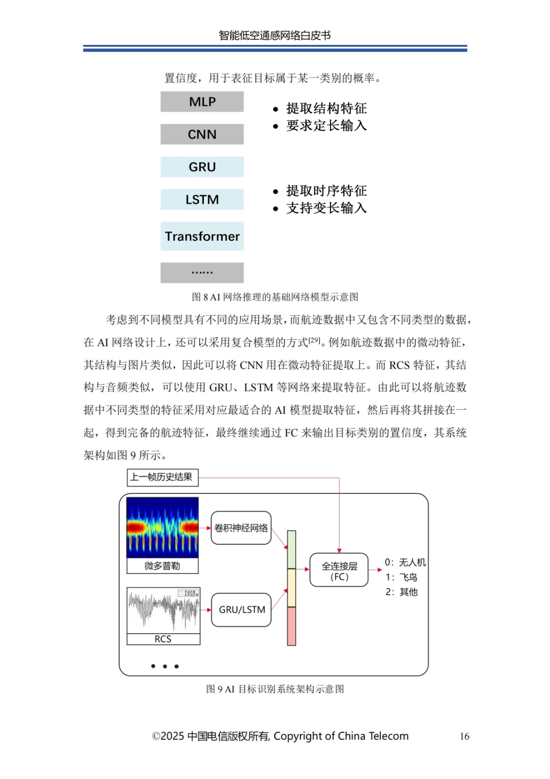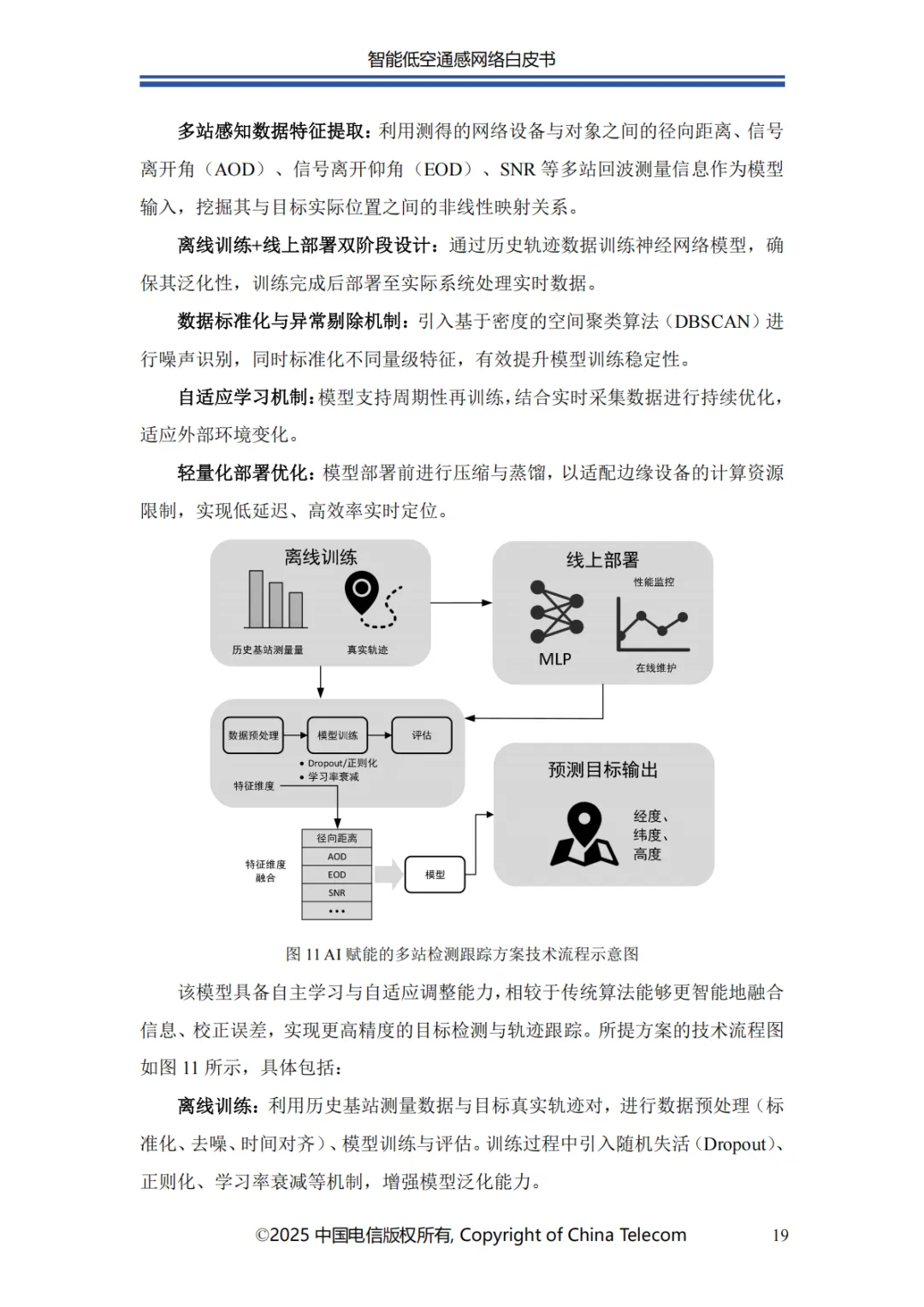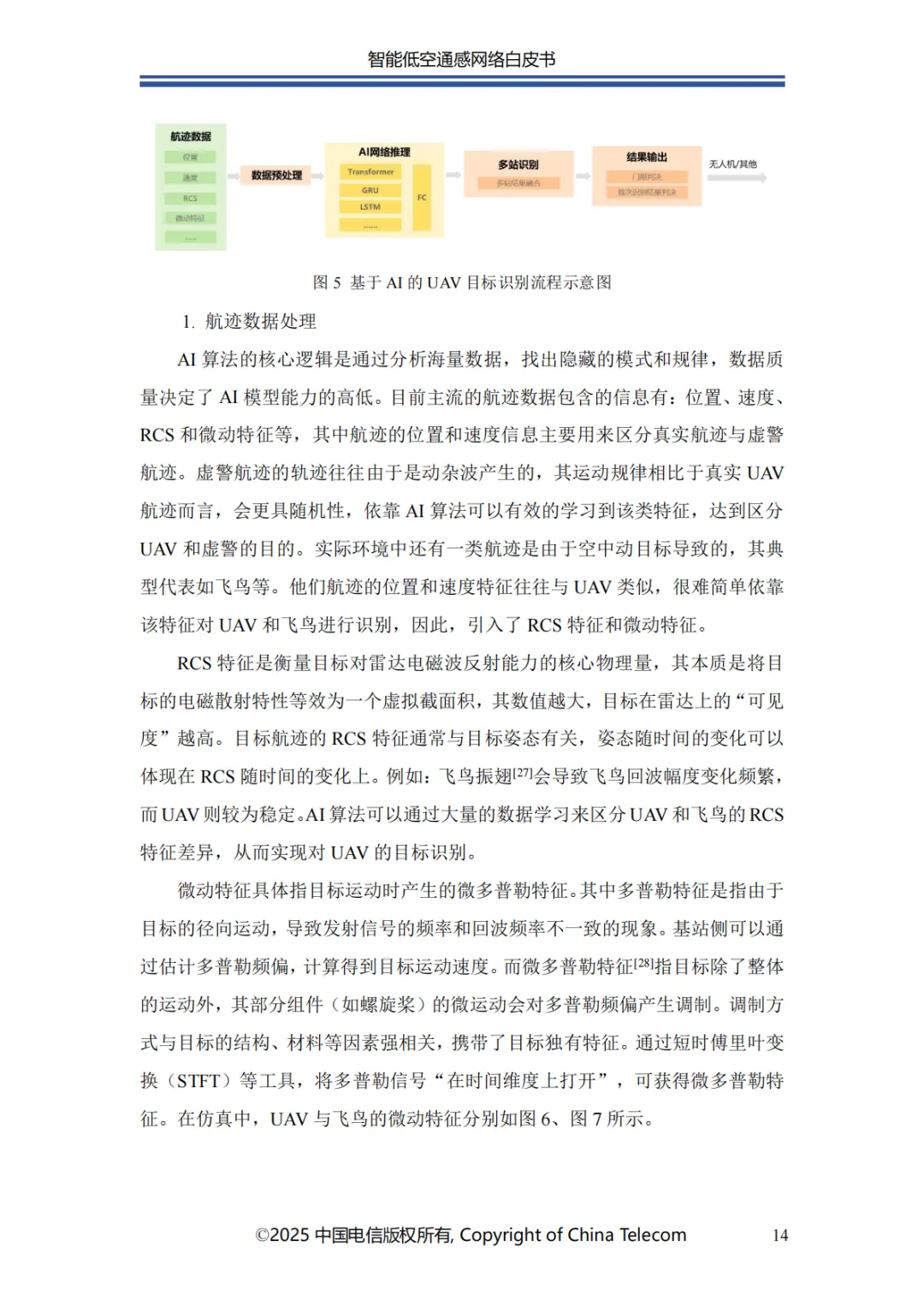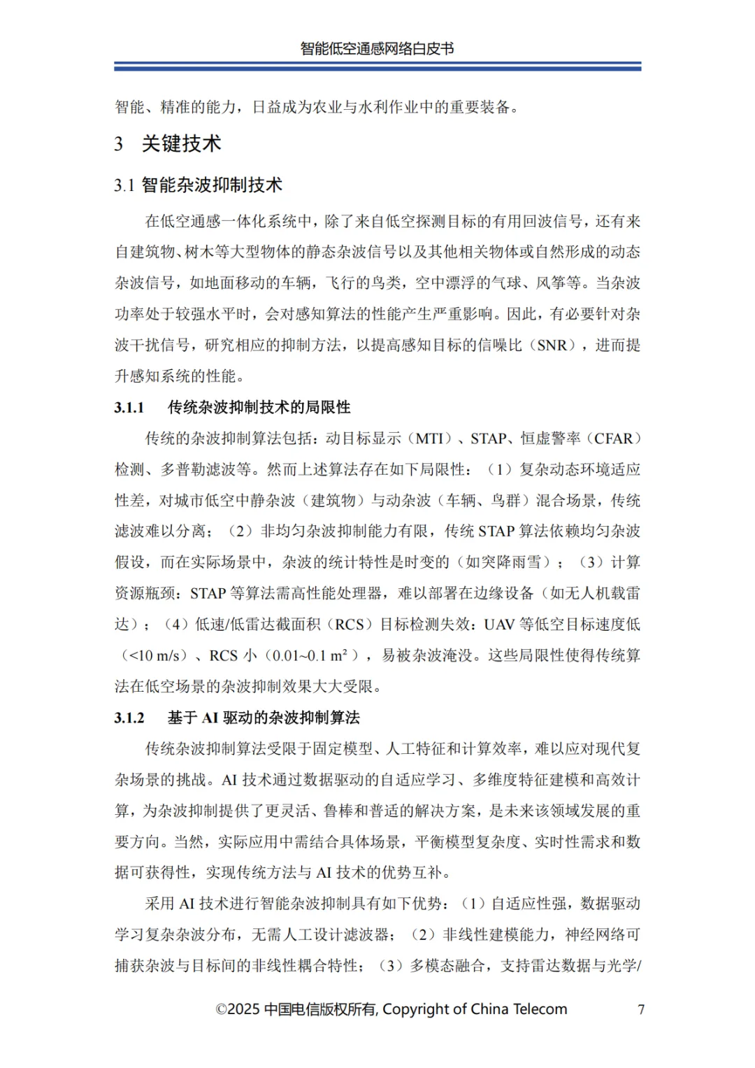 本白皮书首先阐述了智能低空通感网络的发展概况;其次介绍了智能低空通感网络的多种应用场景;随后针对应用场景所需的关键能力,分析了传统非智能通感技术面临的问题与挑战,进而提出创新性解决方案;在杂波抑制方面,提出了融合 AI 技术与传统算法的深度神经网络增强的空时自适应处理(STAP)算法,以实现智能杂波抑制;针对目标识别的难题,介绍了基于 AI 的 UAV 目标识别关键技术,保障对目标的精准识别;为应对目标检测与轨迹跟踪的挑战,提出了AI 赋能的多站检测跟踪方案;此外,还创新性地提出了一种多源感知融合技术架构,有效提升了低空感知的可靠性;最后对智能低空通感网络的未来发展进行总结与展望。